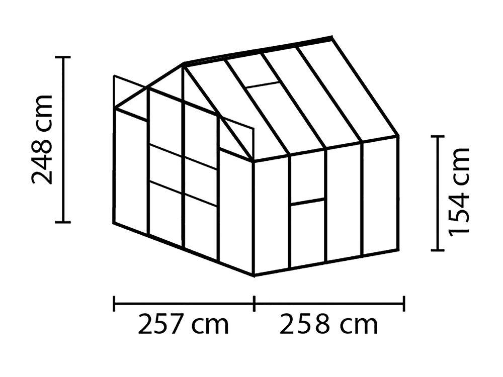 De Jupiter heeft een indrukwekkende hoogte van 248 cm en een breedte van 257 cm. Een dakrandhoogte van 154 cm zorgt voor meer stahoogte en werkruimte. Extra stevigheid wordt bereikt door hoekplaten en verstevigingen in de volledige kas, waardoor je ze zonder zorgen zwaarder kunt belasten.