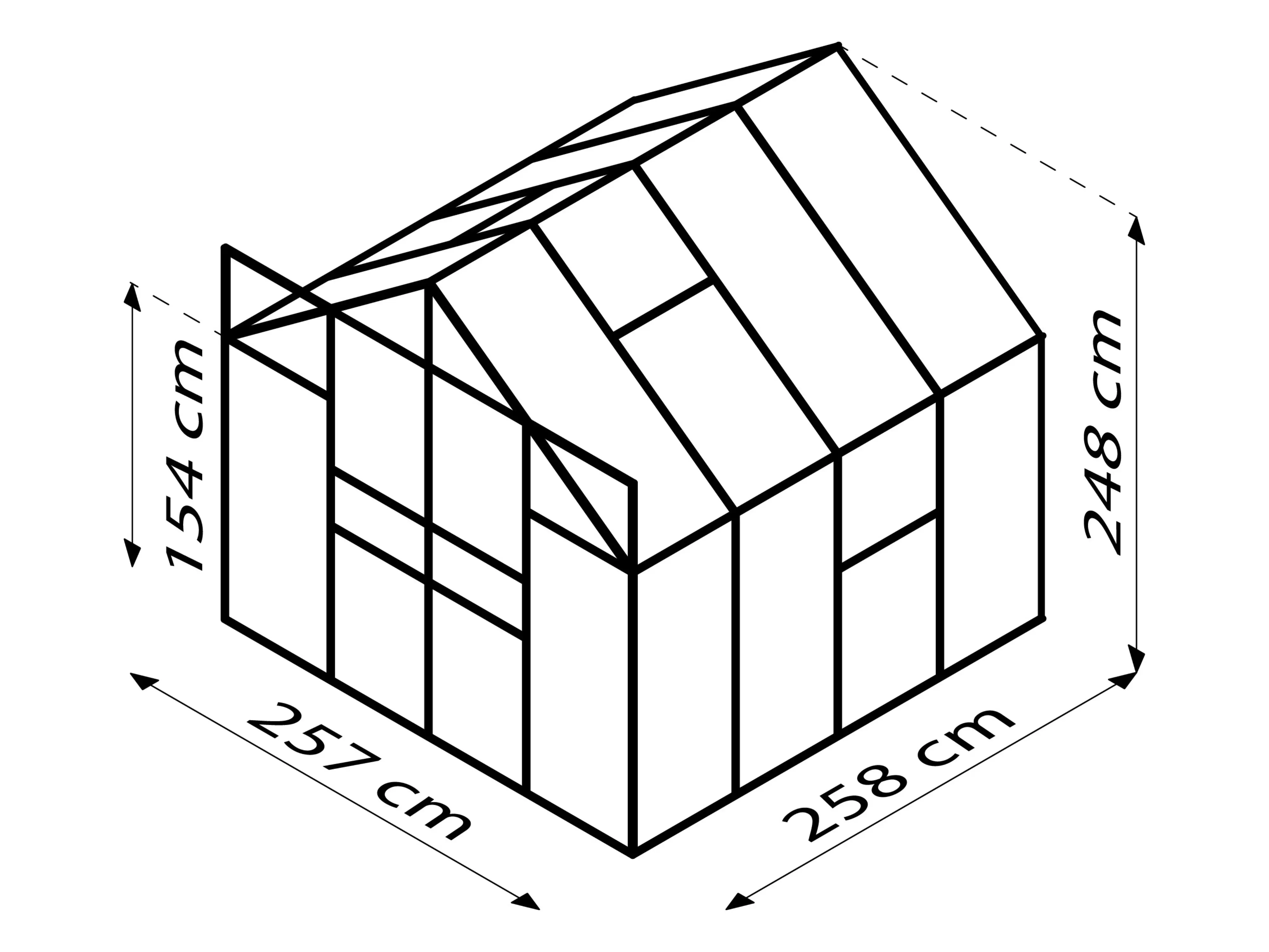 De Jupiter heeft een indrukwekkende hoogte van 248 cm en een breedte van 257 cm. Een dakrandhoogte van 154 cm zorgt voor meer stahoogte en werkruimte. Extra stevigheid wordt bereikt door hoekplaten en verstevigingen in de volledige kas, waardoor je ze zonder zorgen zwaarder kunt belasten.