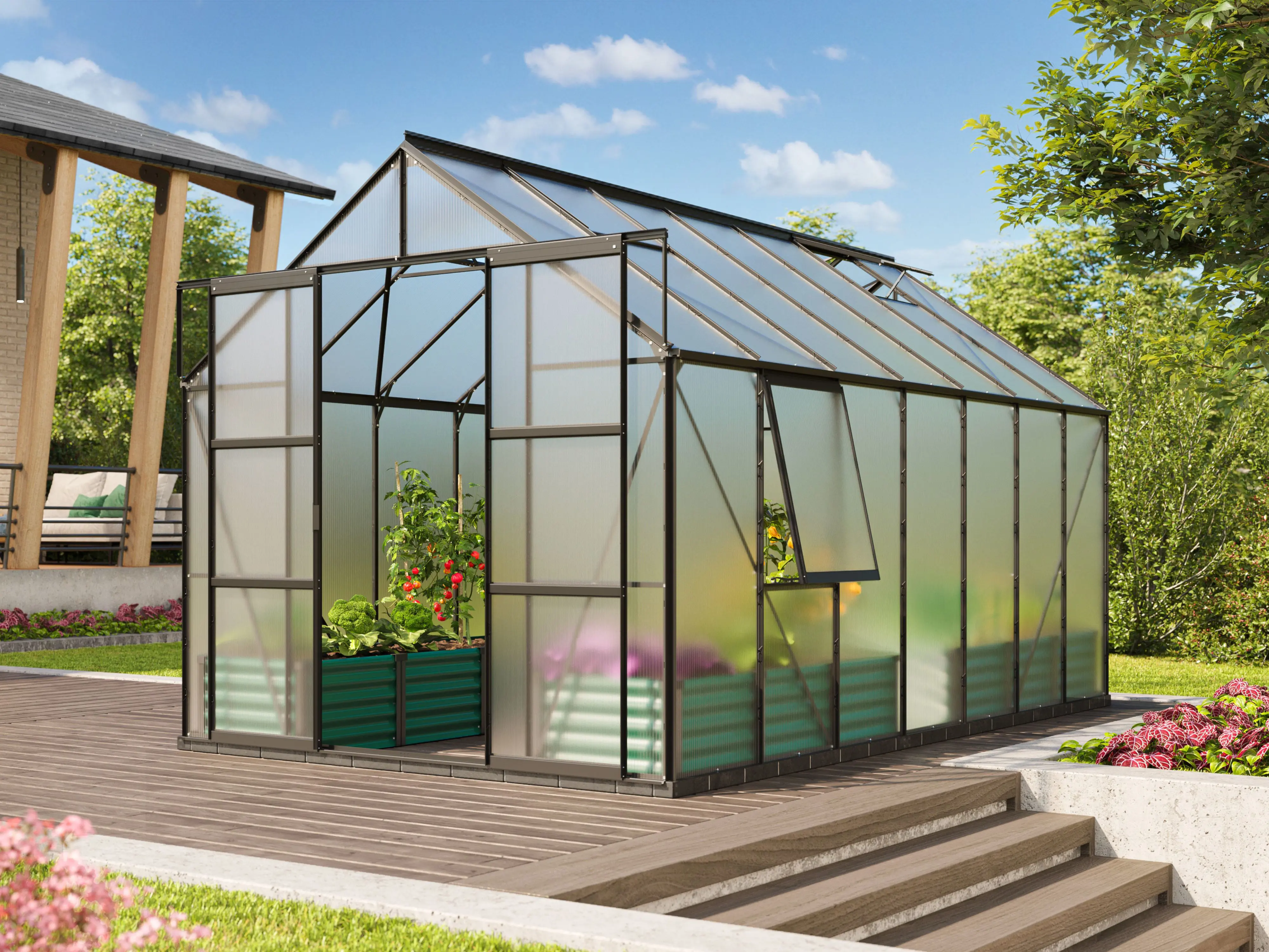 Geef je tuin een stijlvolle upgrade met de tuinkas Jupiter van Vitavia. Deze tuinkas combineert functionaliteit met elegantie. Perfect voor het kweken van groenten en kruiden in een beschermde omgeving. Dit luxueuze model heeft een dubbele schuifdeur, 2 tot 4 dakramen (afhankelijk van de grootte) en een extra zijvenster voor optimale ventilatie.