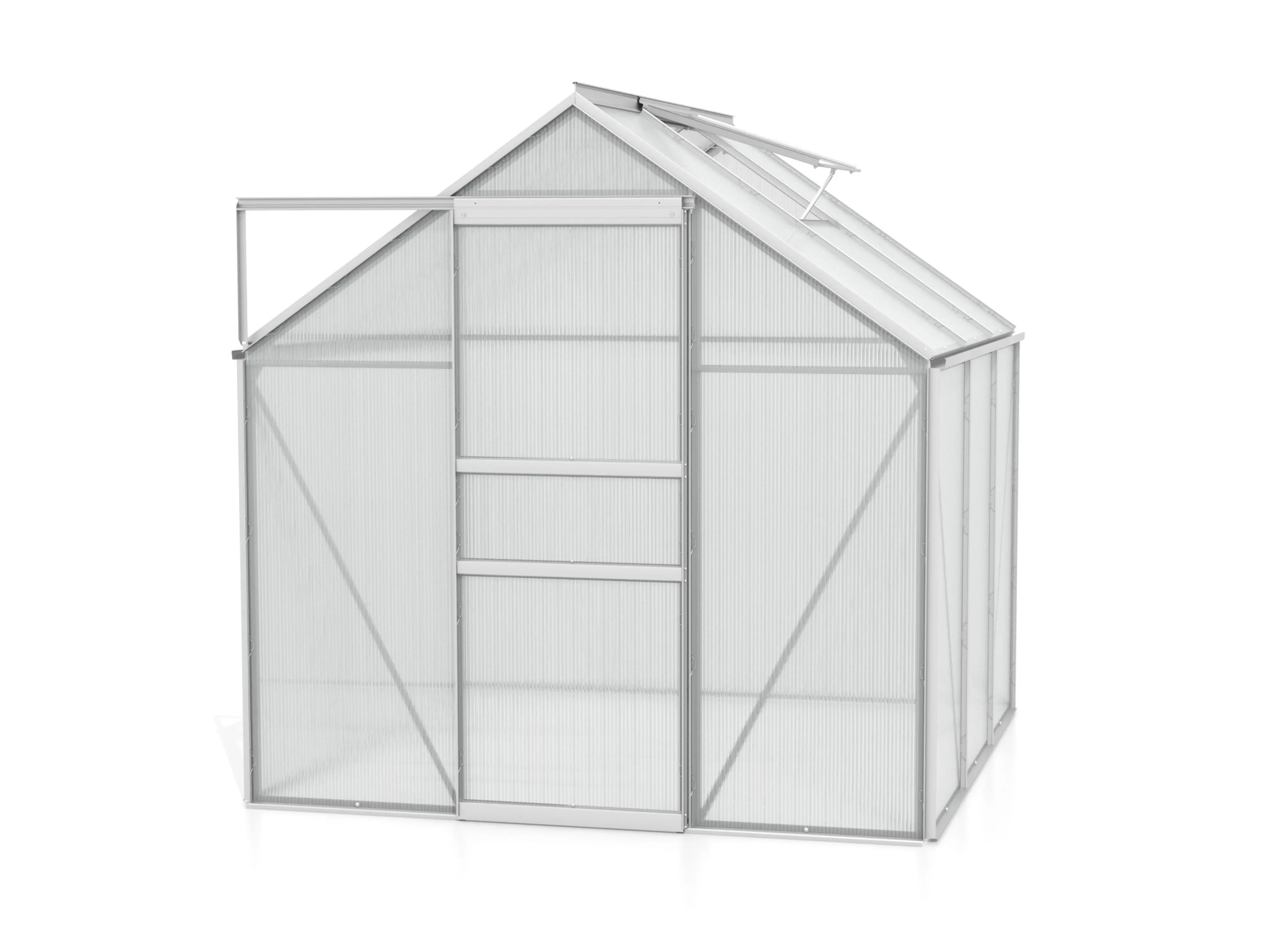 Deze kwalitatieve tuinkas is gemaakt van poedergecoat aluminium, wat zorgt voor een luxueuze en moderne look! Dankzij de schuifdeur, die naar wens links of rechts te plaatsen is, geniet je van optimaal gebruiksgemak en flexibiliteit. Afhankelijk van het formaat heeft de serre één of twee dakramen voor een goede ventilatie en wordt de structuur extra verstevigd met daksteunen.