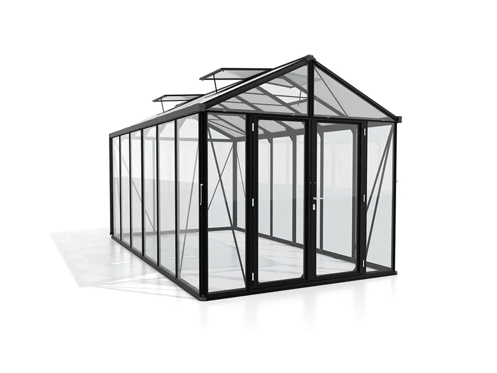 Deze uitvoering wordt standaard geleverd met een luxe dubbele draaideur met slot, wat zorgt voor extra veiligheid, en 2 of 3 dakramen (afhankelijk van de grootte) voor optimale ventilatie. De lange ruiten geven de kas een moderne, elegante uitstraling, terwijl de zwarte afwerking zorgt voor een tijdloze en chique look. Dakgoten, een regenpijpset en funderingsprofielen zijn inbegrepen voor perfecte afwatering en stabiliteit.