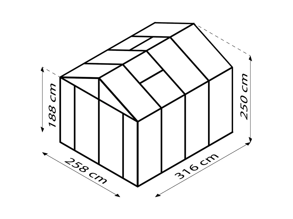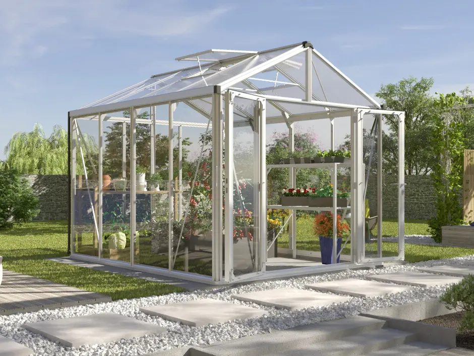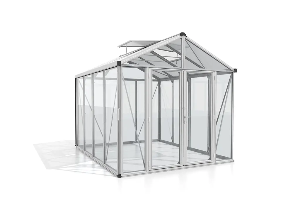 De kas is voorzien van 3 mm dik veiligheidsglas aan de zijkanten en 10 mm dubbelwandige polycarbonaatplaten op het dak. Deze platen verminderen condensvorming en warmteverlies. Het frame, vervaardigd uit geanodiseerd aluminium, is uiterst stabiel en robuust.