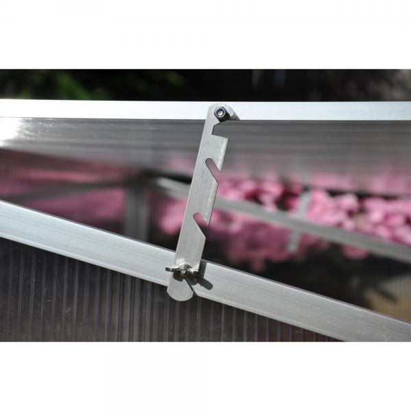 Deze kweekbak bestaat uit een onderhoudsvrij aluminium frame en 4 mm dubbelwandige polycarbonaatplaten. Polycarbonaat heeft verschillende voordelen: het is niet gevoelig voor breuk, geheel veilig in gebruik en heeft bovendien een isolerende werking.