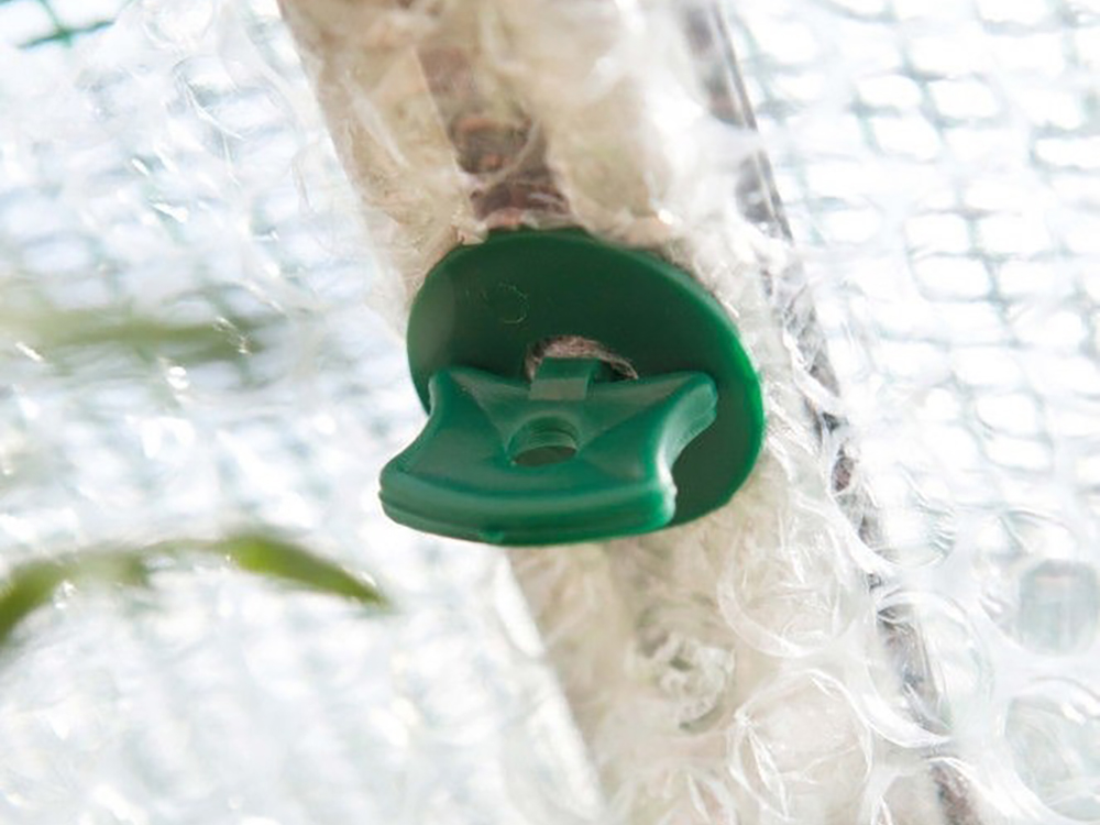 Met behulp van deze clips kan de noppenfolie of schaduwdoek kan heel eenvoudig aangebracht worden (en achteraf terug verwijderd). Ze worden met een halve draai in het aluminium profiel bevestigd.
