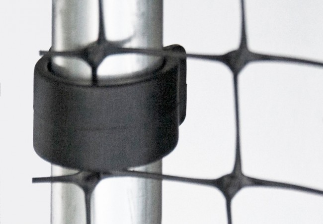 Zwarte kunststof clips voor het vastmaken van netten of vliesdoeken op een aluminium buizenframe.