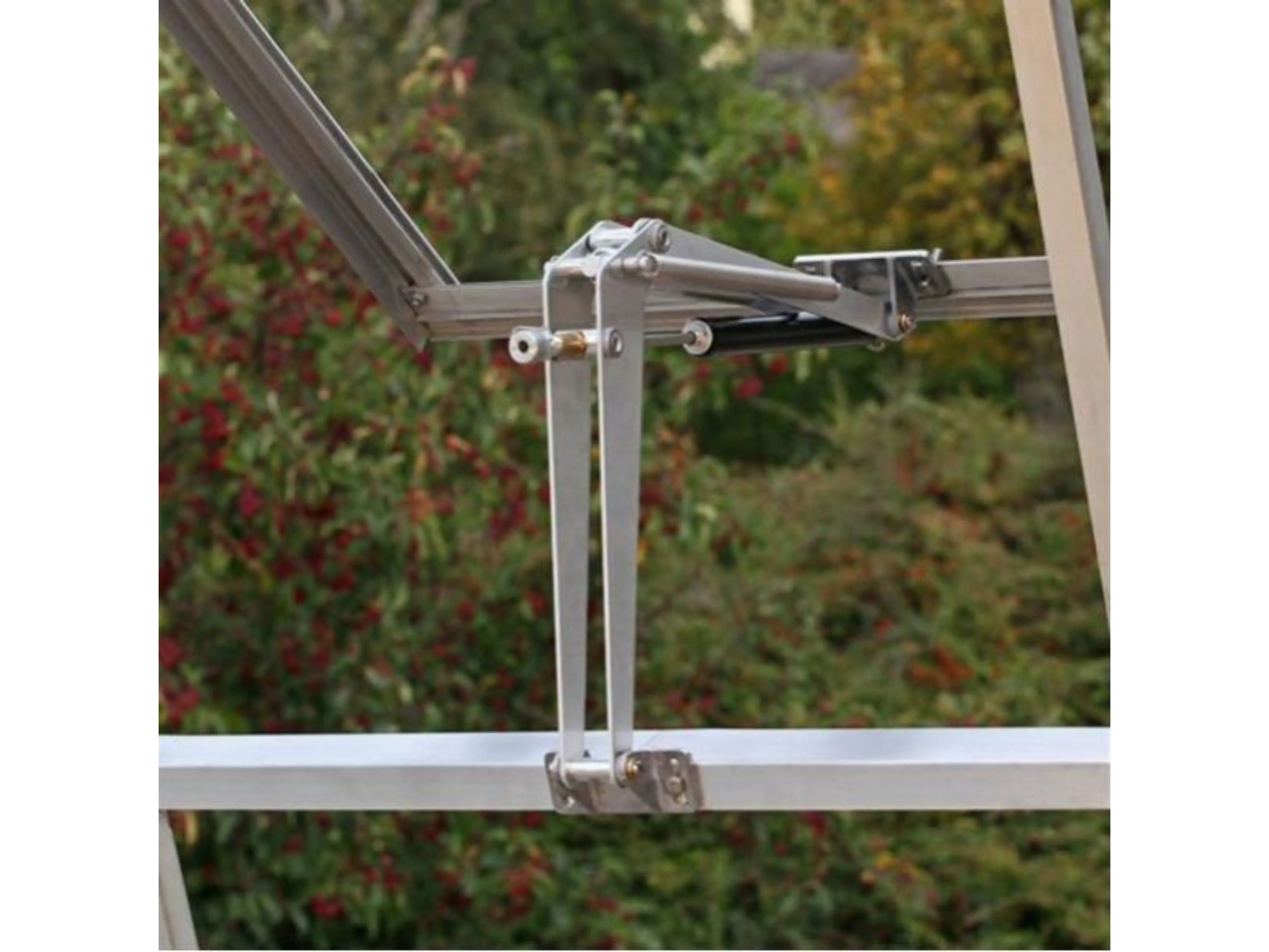 Automatische raamopeners werken op zonnewarmte en zijn onmisbaar in elke kas of serre. Deze Megavent raamopener is een zeer stevige universele raamopener die ramen tot 24 kg kan liften. De raamopener is ontwikkeld voor tuinkassen van zwaardere kwaliteit met dubbele of bredere ramen van bijvoorbeeld 70 cm. De bevestiging is eenvoudig en gebeurd met behulp van bouten en moeren aan het aluminium frame.
