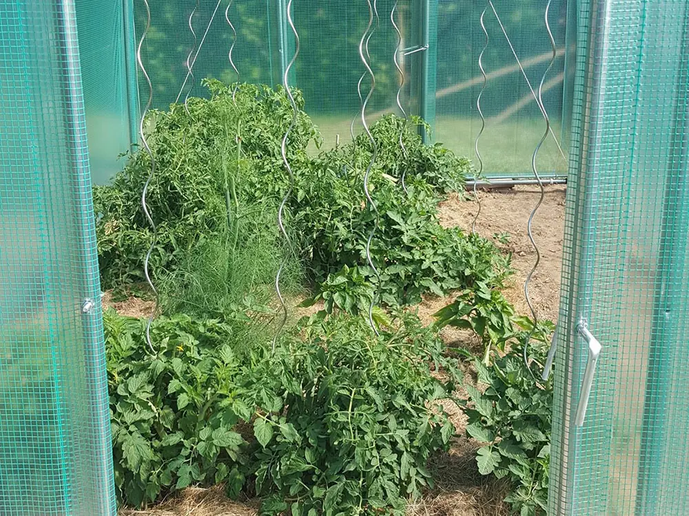 De serre is bedekt met een versterkte, groene transparante PE-folie (200 micron) die diffuus licht doorlaat om te voorkomen dat de planten in de serre verbranden bij warm weer. Het ruime ontwerp met twee rechtopstaande zijkanten van 1,5 m hoog, biedt voldoende ruimte om de volledige grondoppervlakte te benutten. De totale hoogte van de serre is 2 meter.
