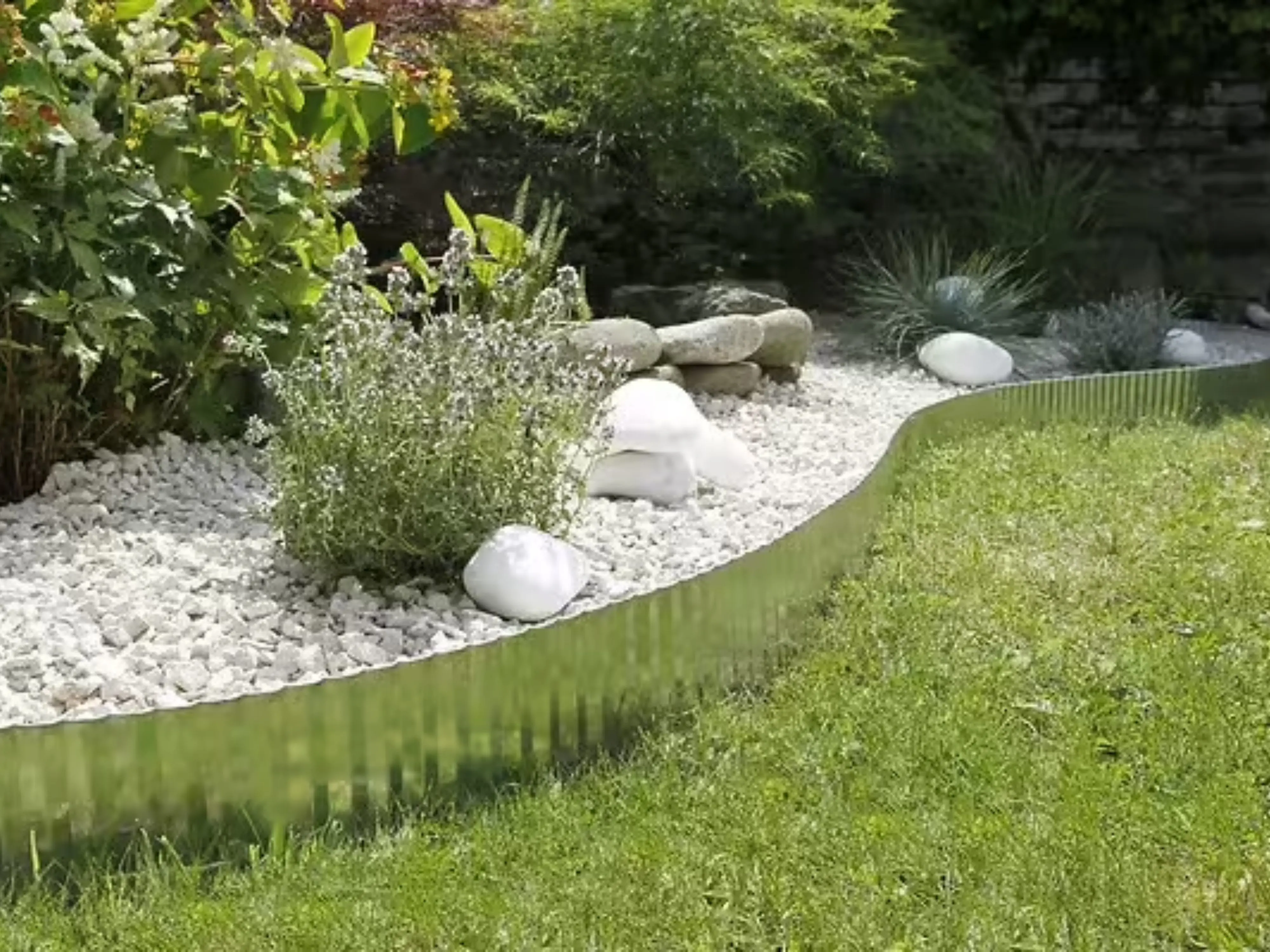 De rand is gemaakt van hoogwaardig verzinkt staal, waardoor hij bijzonder sterk en duurzaam is. Dankzij de soepele structuur is hij eenvoudig te plaatsen. De omgezette boven- en onderrand zorgt bovendien voor extra veiligheid tijdens plaatsing en gebruik. De subtiele golfvorm geeft de rand een stijlvolle uitstraling en combineert mooi met grind, grondmatten en groenbeplanting.