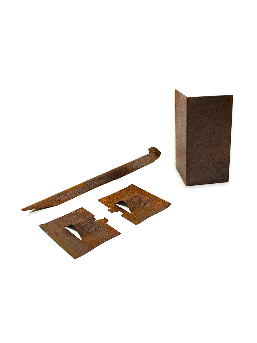 Corten staal roest onmiddellijk bij contact met de lucht (luchtvochtigheid). Mogelijks is dit proces nog niet gestart bij levering en hebben de hoekstukken nog een neutrale stalen kleur. De roestlaag vormt nadien een natuurlijke beschermlaag op het staal.