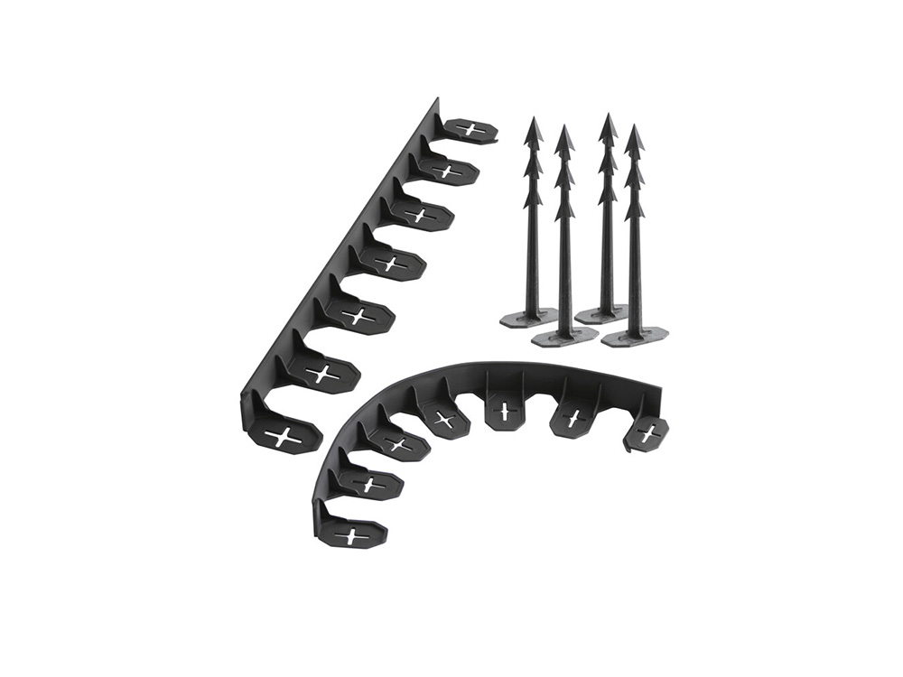 De 8 rechte borderlatten zijn goed te buigen waardoor je er zowel rechte borders kan mee afboorden alsook golvende borders tot cirkels mee kan vormen. Met behulp van de 24 grondpennen zet je de latten stevig vast in de gewenste vorm. Deze zwarte afboording is gemaakt van stevig, weerbestendig polypropyleen.