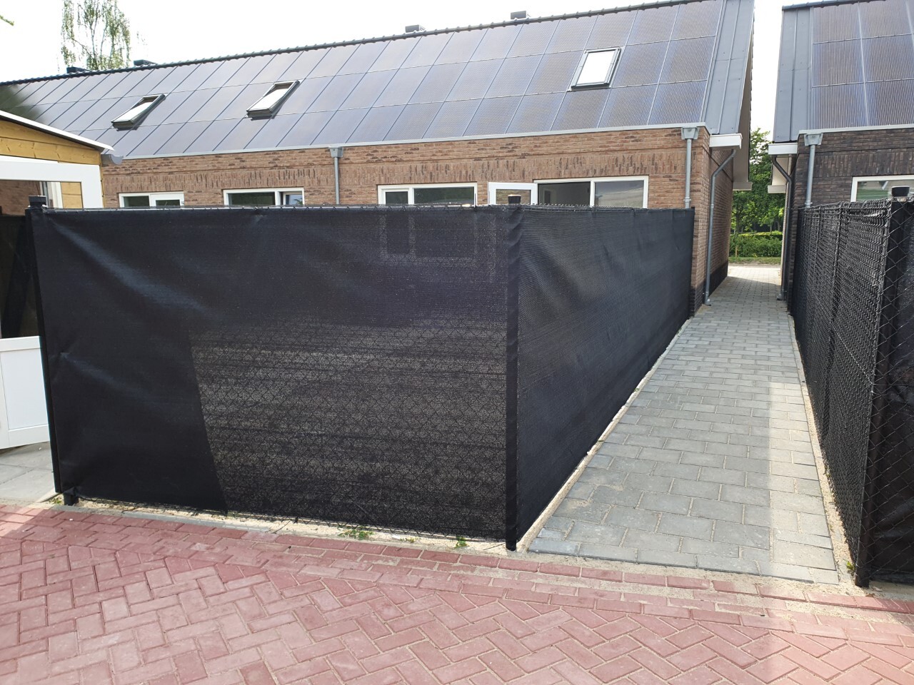 Het doek is aan de boven- en onderkant voorzien van een ingeweven bevestigingsbaan, waardoor een binddraad of een metaaldraad geregen kan worden. Het zwarte net breekt het zicht, waardoor je minder inkijk hebt. Daarnaast zorgt dit net ervoor dat jouw perceel grotendeels windvrij blijft.