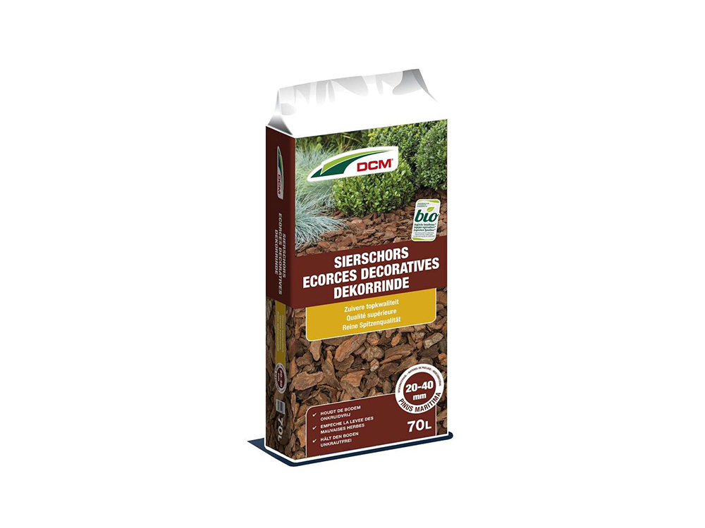 DCM Sierschors is een bruinrode schors die geschikt is als als decoratieve en efficiënte bodembedekker. Een laagje voorkomt onkruidgroei en beschermt de bodem tegen sterke temperatuurschommelingen zowel in de zomer als in de winter.