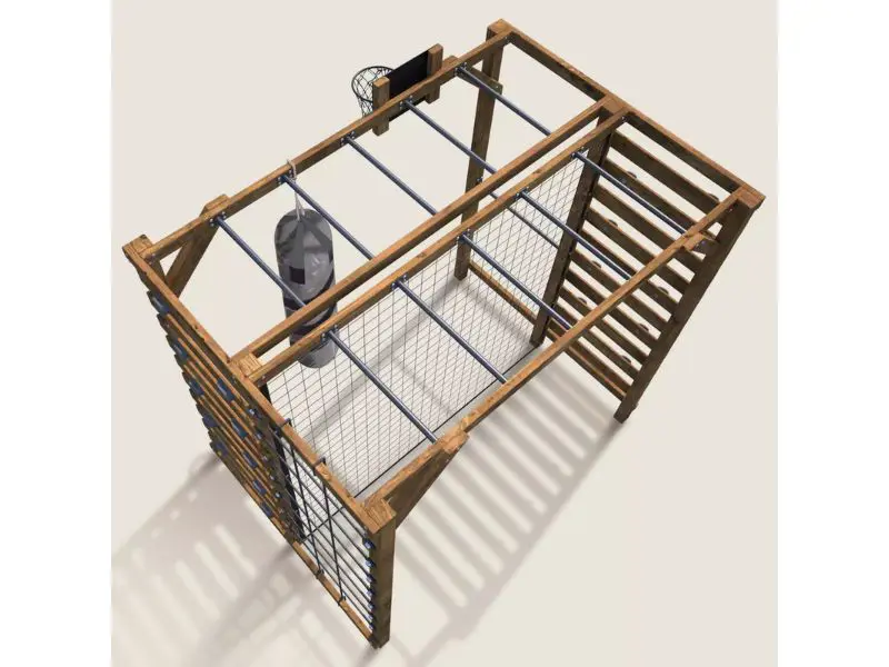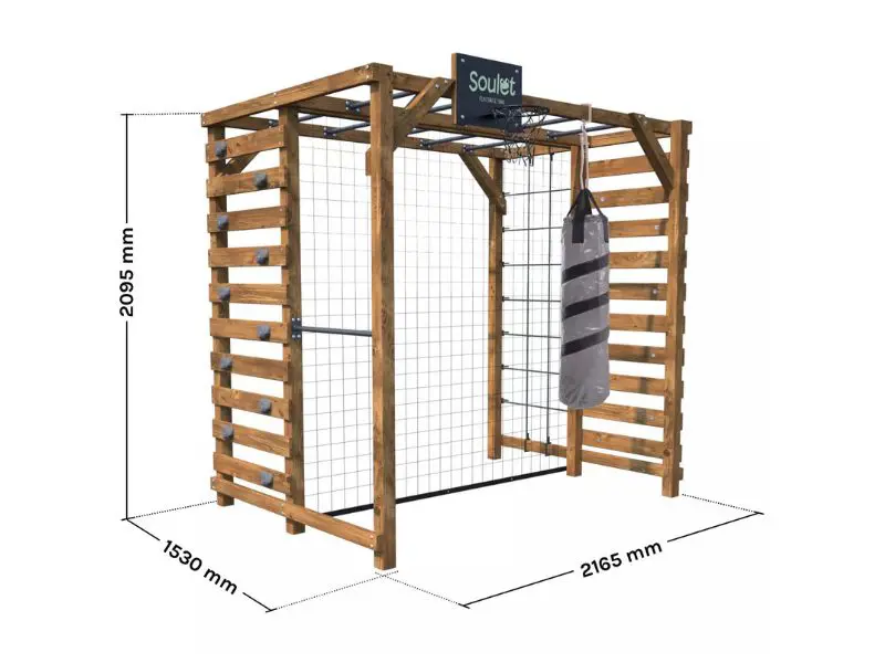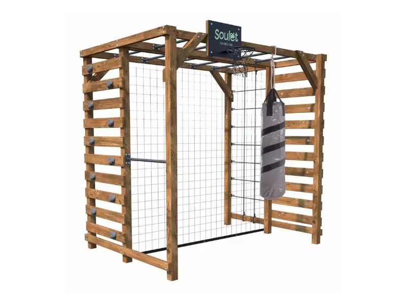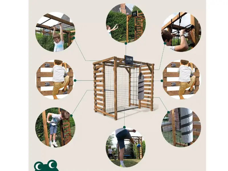 De klimwand en het klimnet maken het mogelijk om te klimmen en nieuwe sensaties te ervaren, terwijl de optrekstang helpt bij het versterken van de spieren. Een complete speeltuin die elke speelsessie omtovert tot een echte fysieke training.