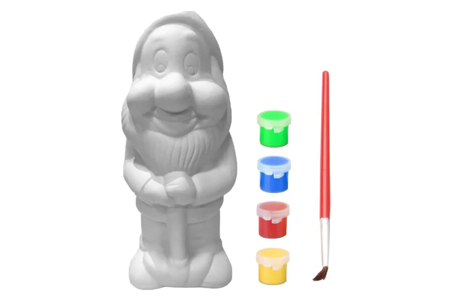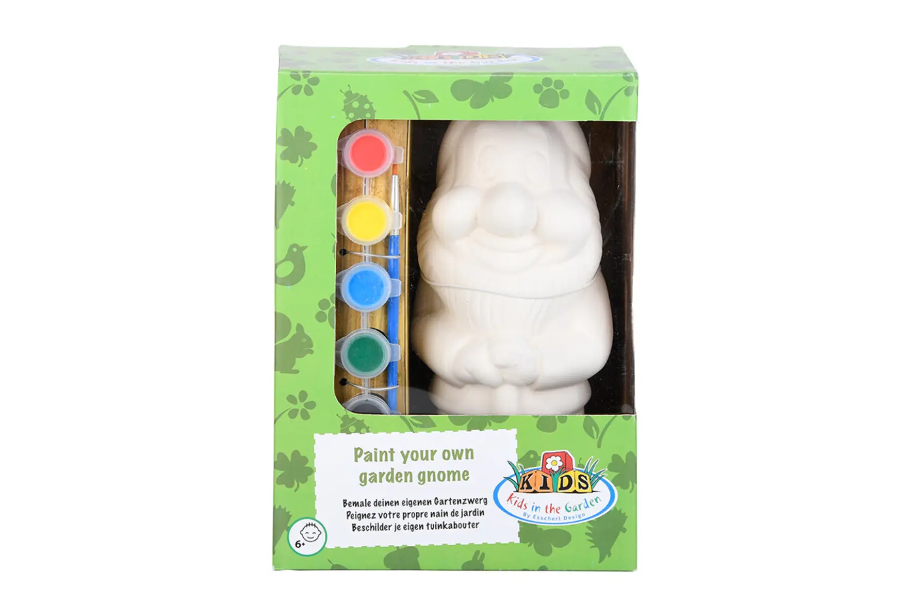 Het setje bevat een onbeschilderde tuinkabouter in gips, 6 kleurtjes en een verfborstel.