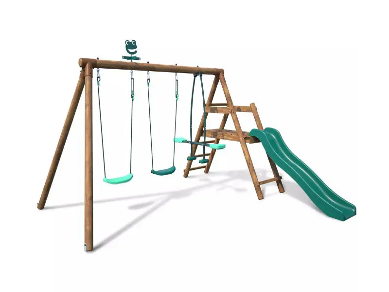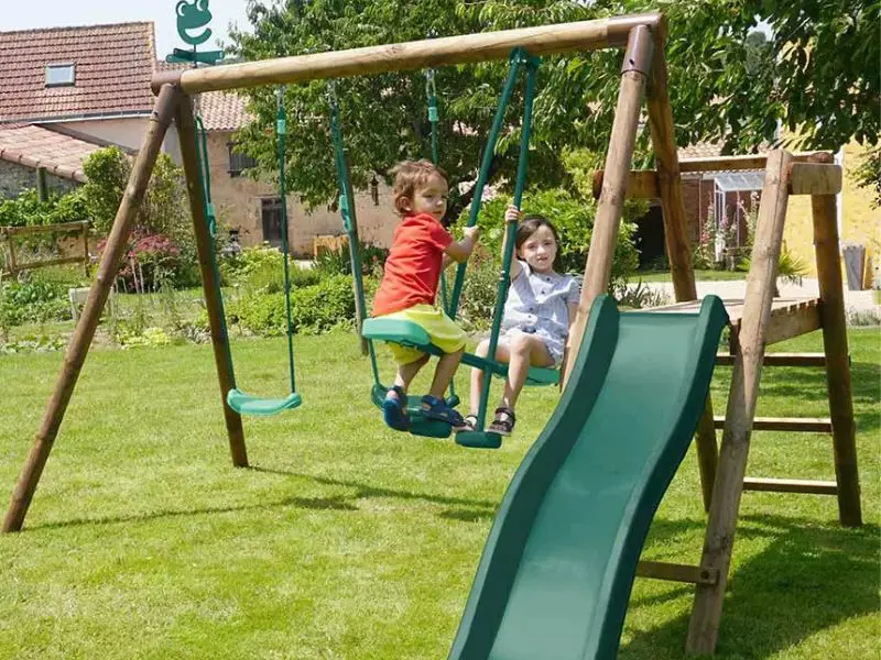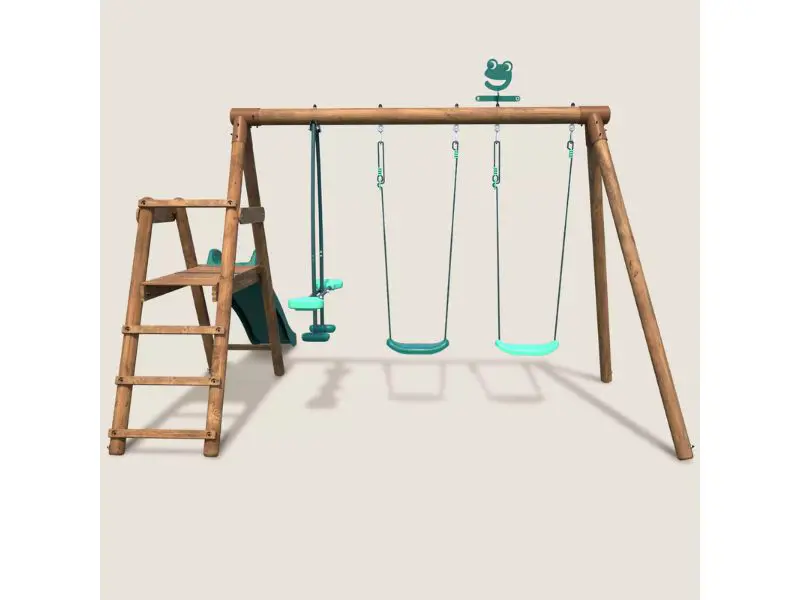Houten schommel met 3 speeltoestellen en glijbaan FIGUE