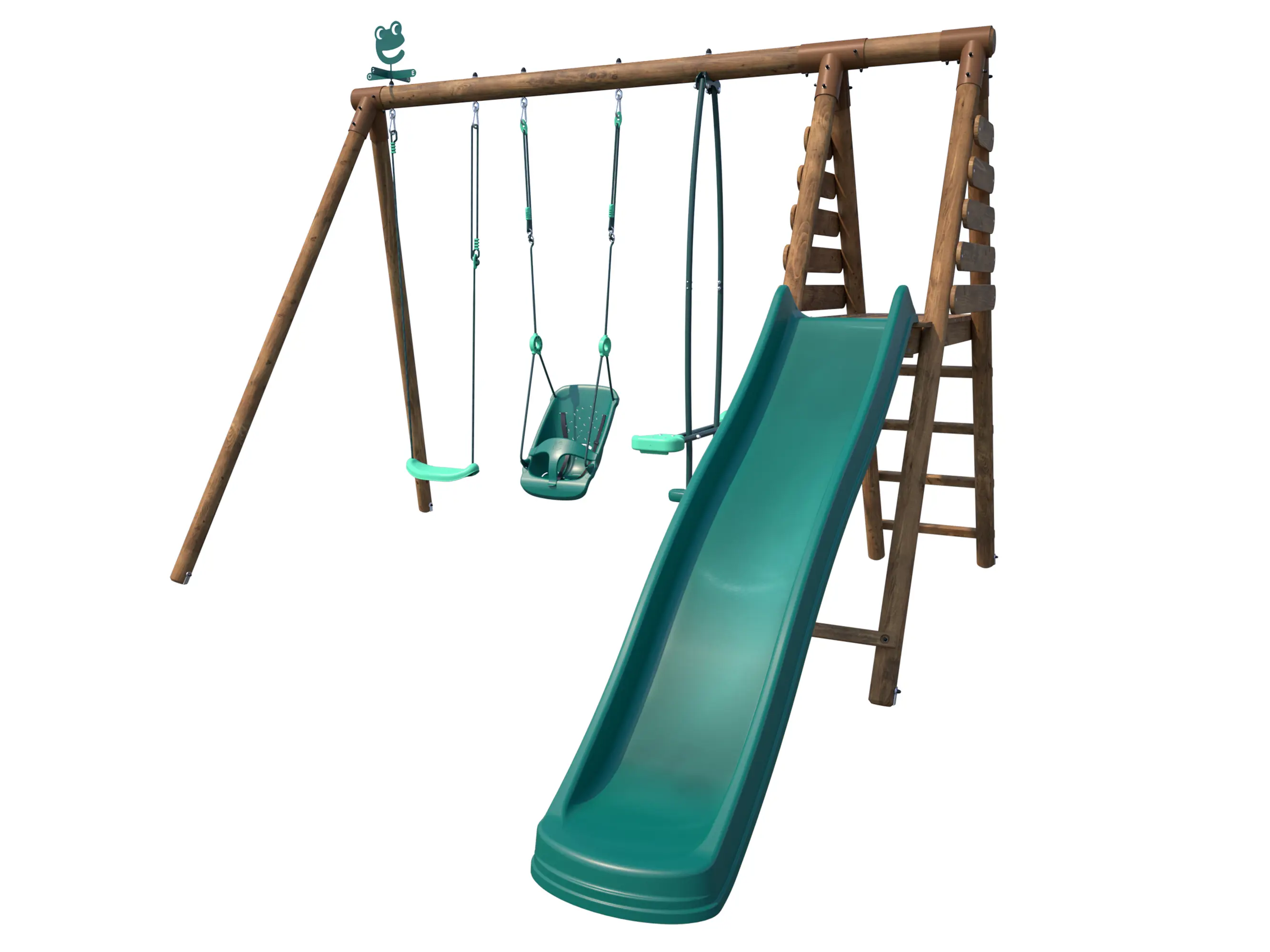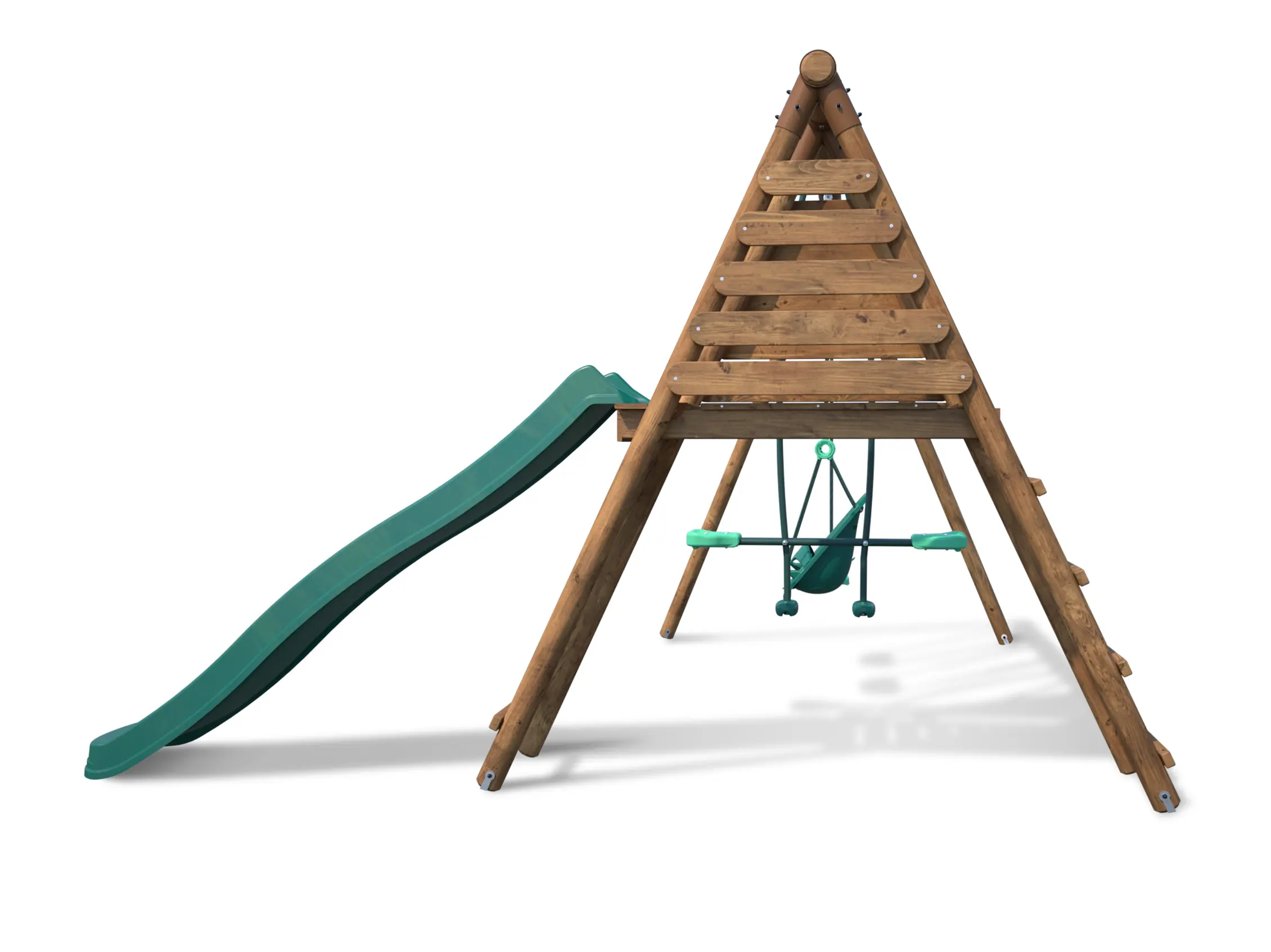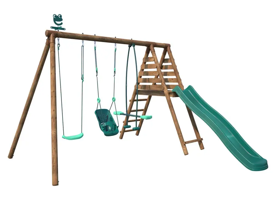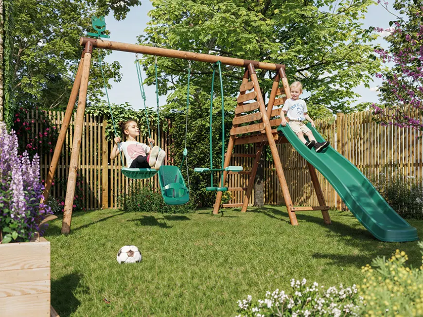 De schommel is uitgevoerd met een duo-schommel, waardoor je gezellig samen met een vriendje of familielid kunt schommelen. Daarnaast is er ook een glijbaan aanwezig, waar je met volle vaart vanaf kunt glijden.