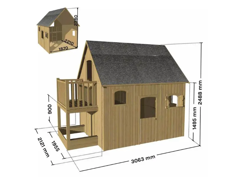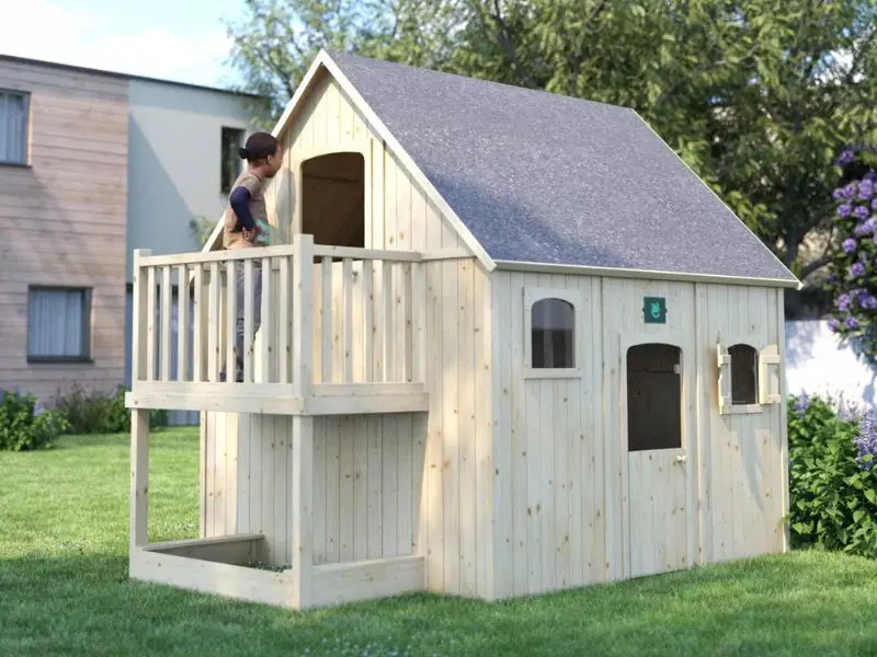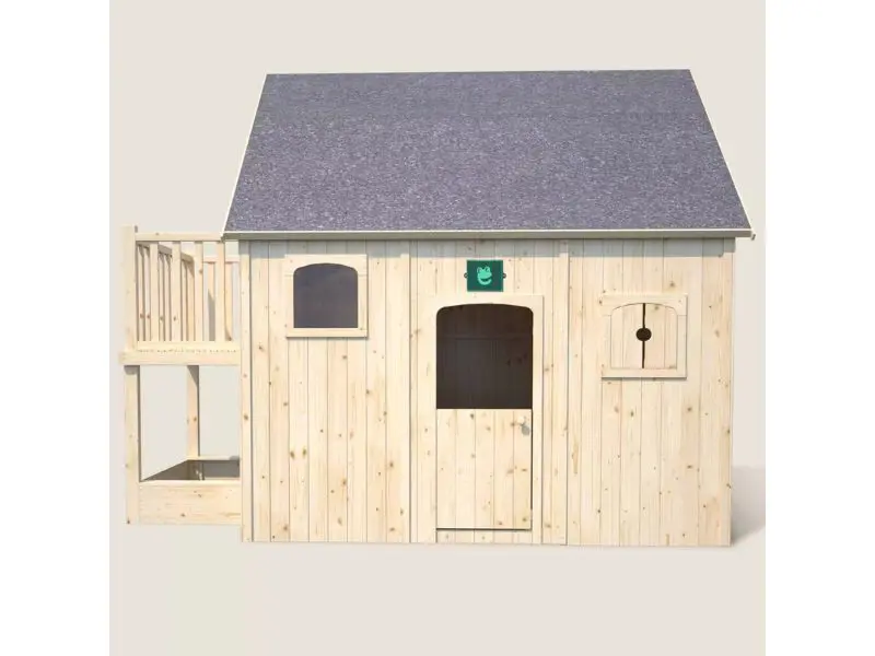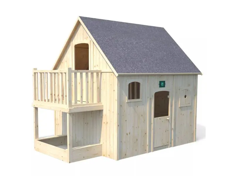 Het Duplex-speelhuisje is een houten huisje dat is ontworpen om kinderen van 3 tot 12 jaar een veilige en stimulerende speelruimte te bieden. Met zijn twee verdiepingen, balkon en ingebouwde zandbak verandert dit speelhuisje de tuin in een heus avonturen- en fantasieterrein. Het robuuste ontwerp en de verzorgde afwerking maken het een ideale keuze voor gezinnen die veiligheid, functionaliteit en esthetiek willen combineren in een duurzaam buitenspeelhuis.