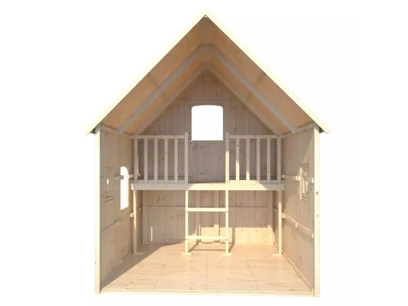 Het Duplex-speelhuis biedt comfortabel plaats aan maximaal 8 kinderen dankzij de royale binnenafmetingen van 4,13 m² (221 cm x 187 cm). Door de toevoeging van een mezzanine van 1,46 m² en een balkon van 0,78 m² wordt de speelruimte vergroot en ontstaan er zones voor verschillende soorten activiteiten. Alle toegangen op hoogte zijn voorzien van leuningen om de veiligheid van de kleine avonturiers te garanderen.