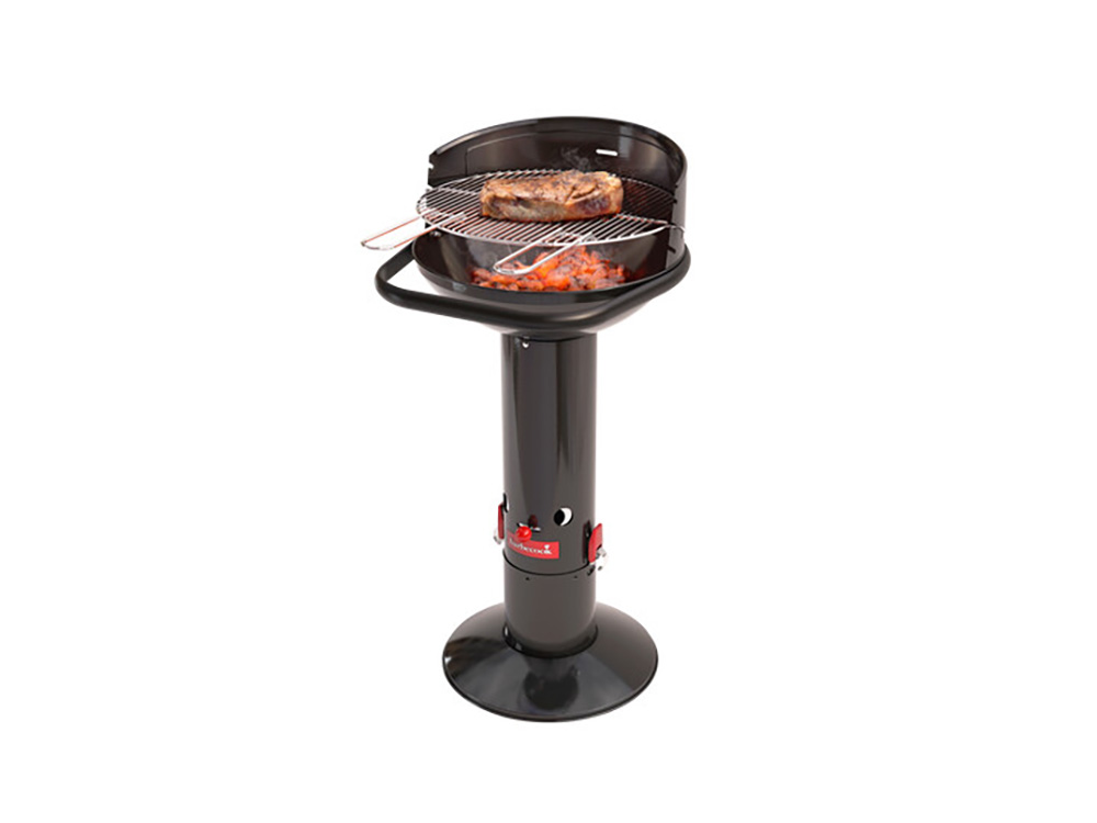 Het verchroomd rooster is verstelbaar in drie posities. Deze uitvoering van Barbecook barbecue Loewy heeft een zwarte look en is gemaakt uit geëmailleerd staal.