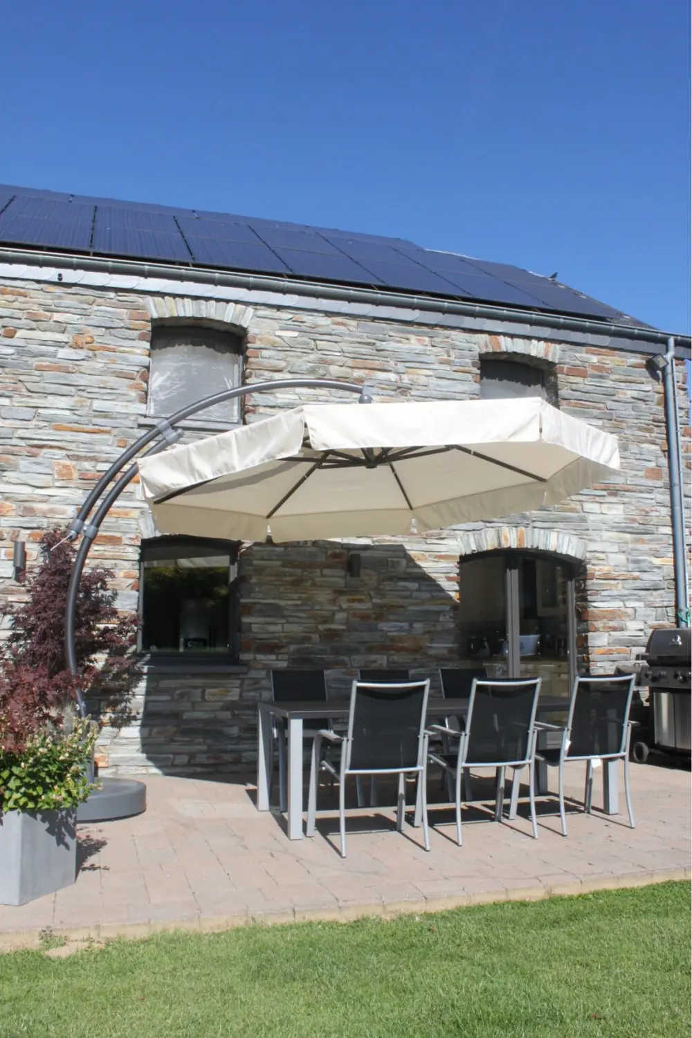 Het taupe olefin doek heeft een ventilatieopening om windopvang te beperken. Een uniek remsysteem voorkomt schokken op het doek of de mast wanneer de parasol open staat. De zomen hebben dubbele naden en elke spaak heeft een veerbelaste zuiger om jouw parasol extra te beschermen. De antracietkleurige voet van hars kan gevuld worden met water, zand, grind of klinkers tot 150 kg.