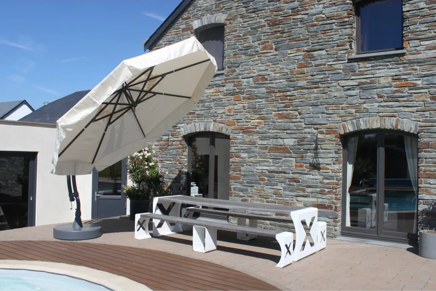 De grote Easy Sun 350 klassiek parasol kan tot 45° kantelen en biedt op elk moment van de dag bescherming tegen de zon. Twee wiggen bovenop zorgen voor een betere positionering van het doek tijdens het kantelen. De aluminium mast met epoxy coating (70 mm diameter) draait 360° op zijn centrale as, en dankzij een vergrendeling kan je de rotatie blokkeren. Het katrolsysteem maakt het openen en sluiten van de parasol eenvoudig en duurzaam.