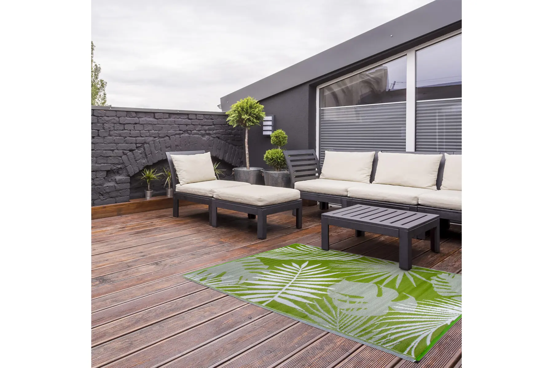 Het buitentapijt is waterdoorlatend en kan het ganse jaar buiten liggen onder de tuintafel op het terras, balkon, in het tuinhuis, veranda of naast het zwembad.