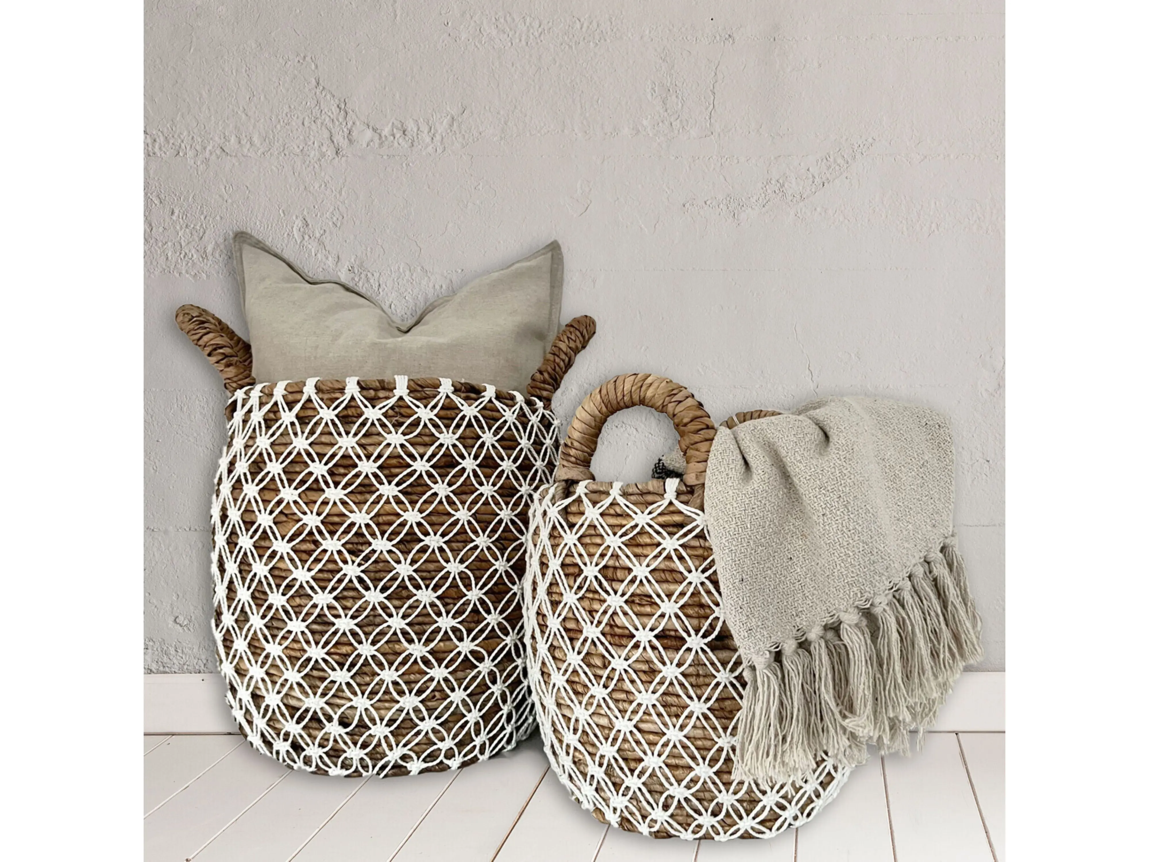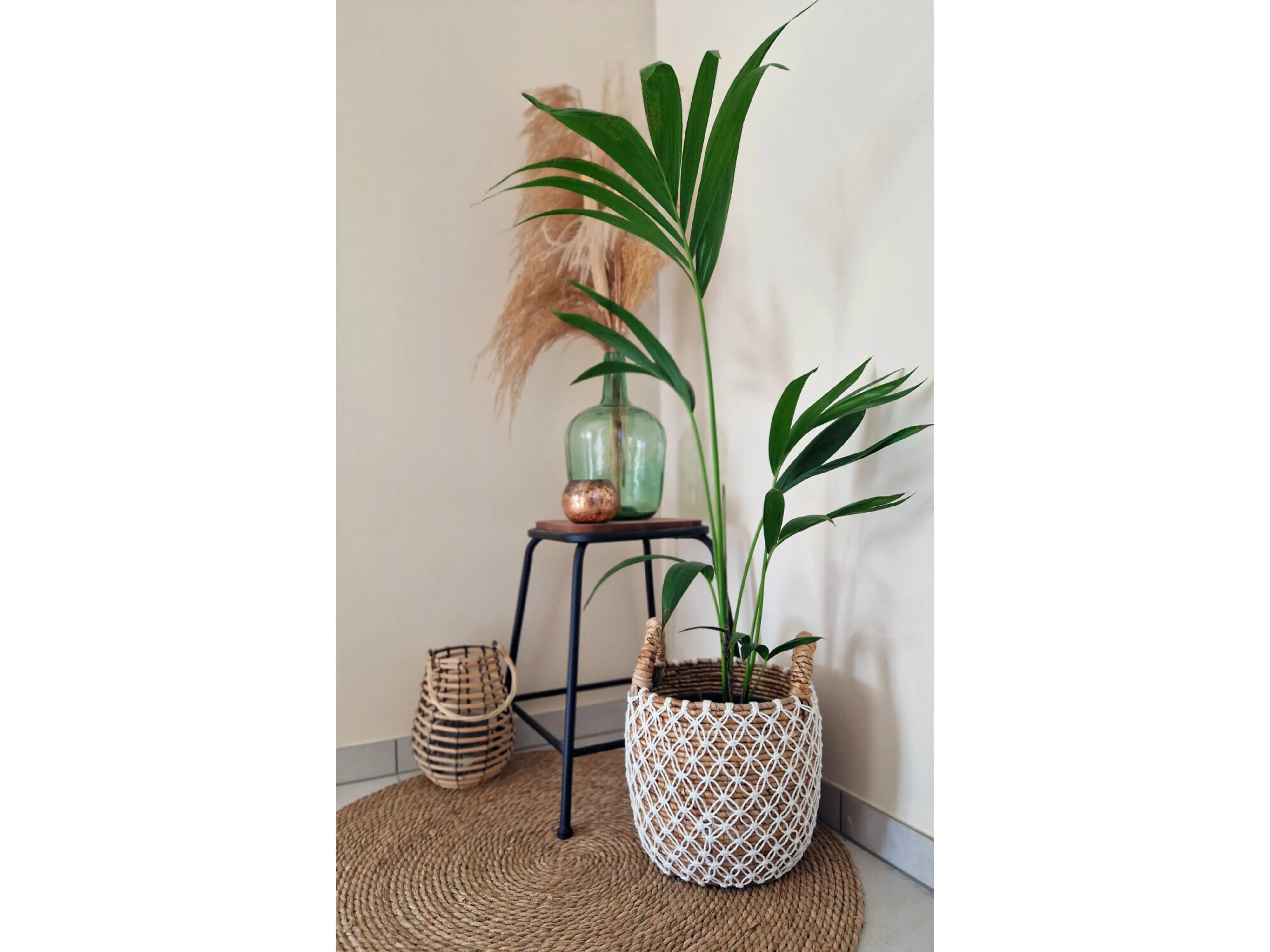 De bloempot in een naturel kleur is aan de buitenzijde afgewerkt met een geweven motief in witte stevige katoendraad. Dit motief zorgt voor een speels effect en maakt hem helemaal uniek. Met de twee voorziene handvaten kan je de bloempot makkelijk verplaatsen.