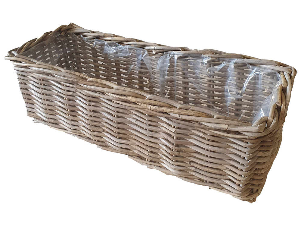 Rieten bloembak dat past op elk landelijk terras. Deze mand is voorzien van plastic folie en kan dus worden gebruikt als binnen- en buitenpot.