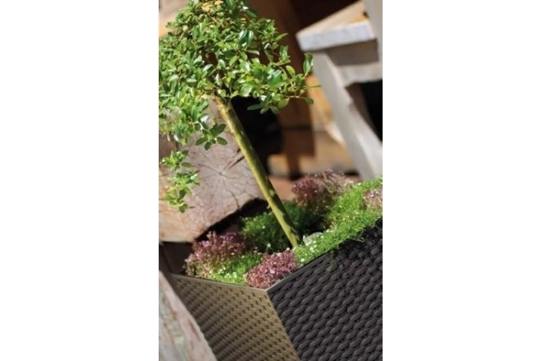Mooie vierkante sierpot in duurzaam kunststof. Deze bloempot is afgewerkt met een mooie ratan-look waardoor je de indruk krijgt dat het geweven kunststof is.