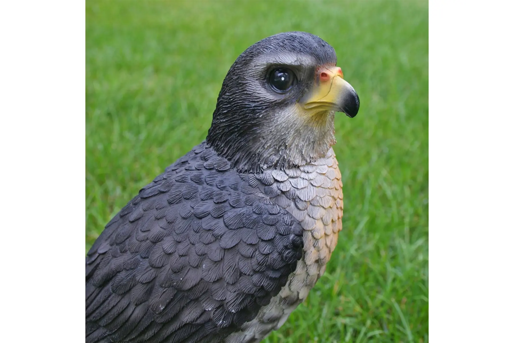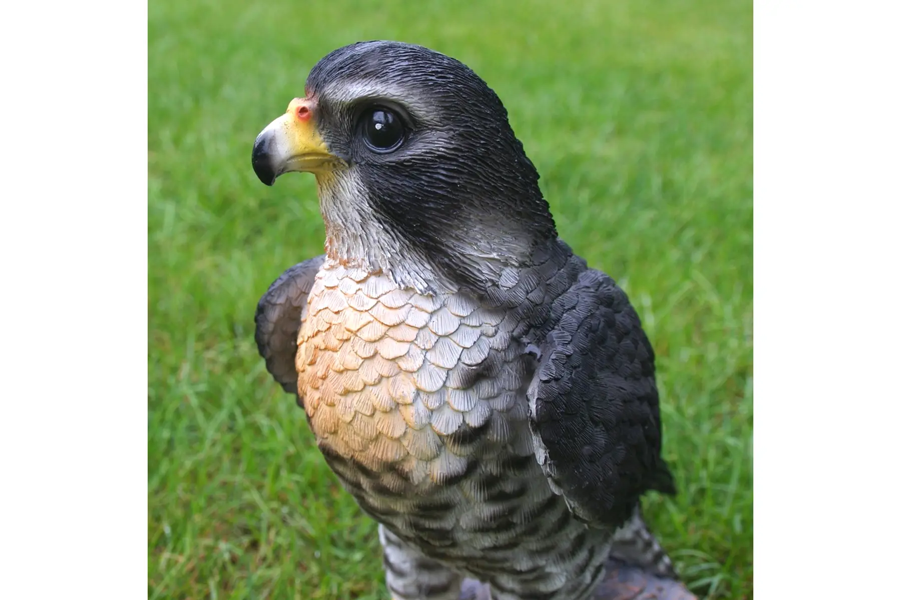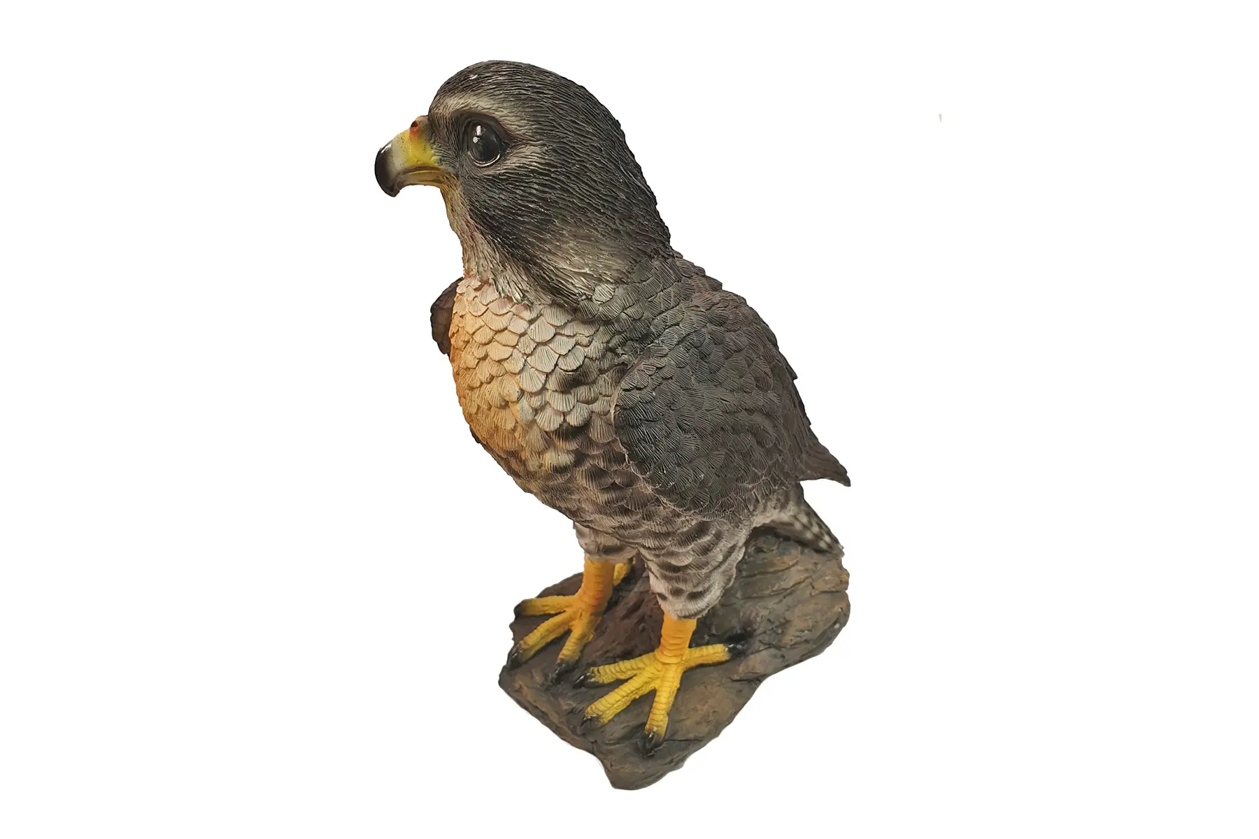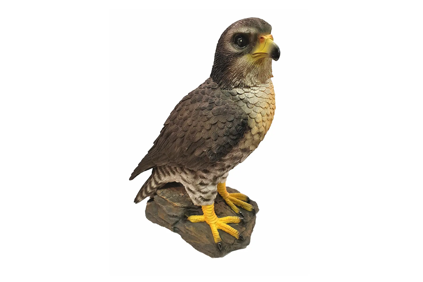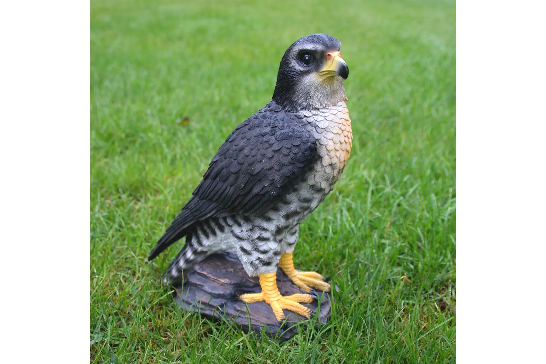 Dit beeld van een rustende valk op een boomstronk lijkt de omgeving gade te slaan. Bij dit beeld zijn alle details heel mooi weergegeven en lijkt de roofvogel net echt. Het beeld is gemaakt uit polyresin, een duurzame kunsthars dat tegen heel wat weersinvloeden bestand is.