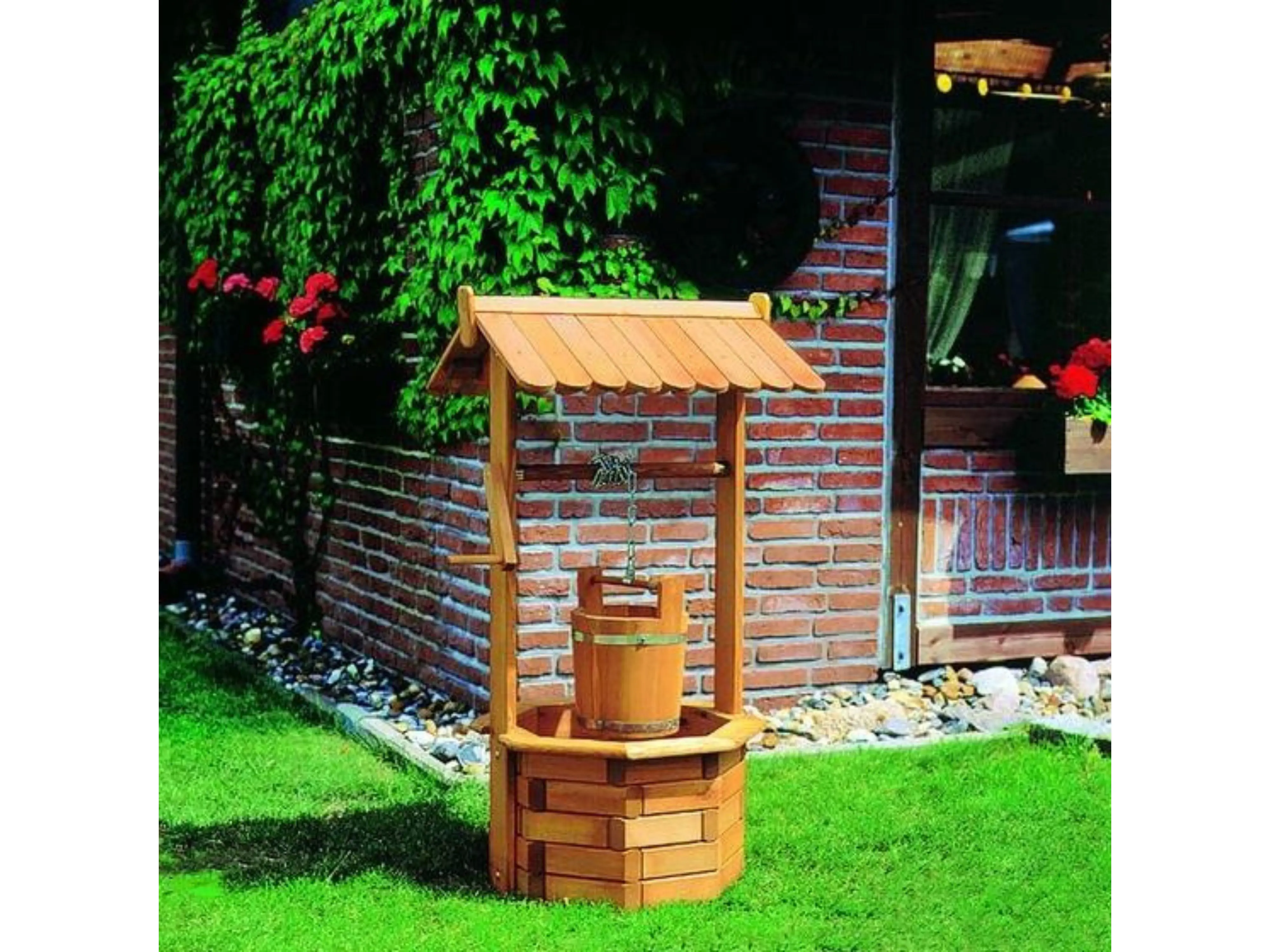 De houten waterput in massief grenenhout is een heuse blikvanger in kleine tuintjes of op het terras. Het geheel is zeer gemakkelijk te monteren en wordt geleverd met houten emmer en kettingen.