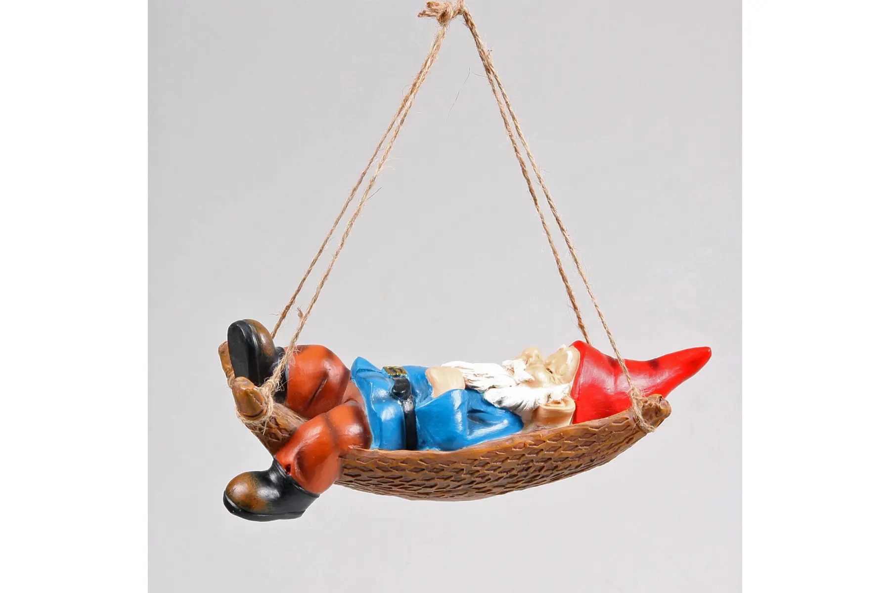 Hang de kabouter op in de tuin aan een boom, struik of muurhaak zodat hij zachtjes kan schommelen in de wind. Ook in het interieur kan hij voor sfeer en gezelligheid zorgen. Het beeld is gemaakt van polyresin, een duurzame kunsthars.