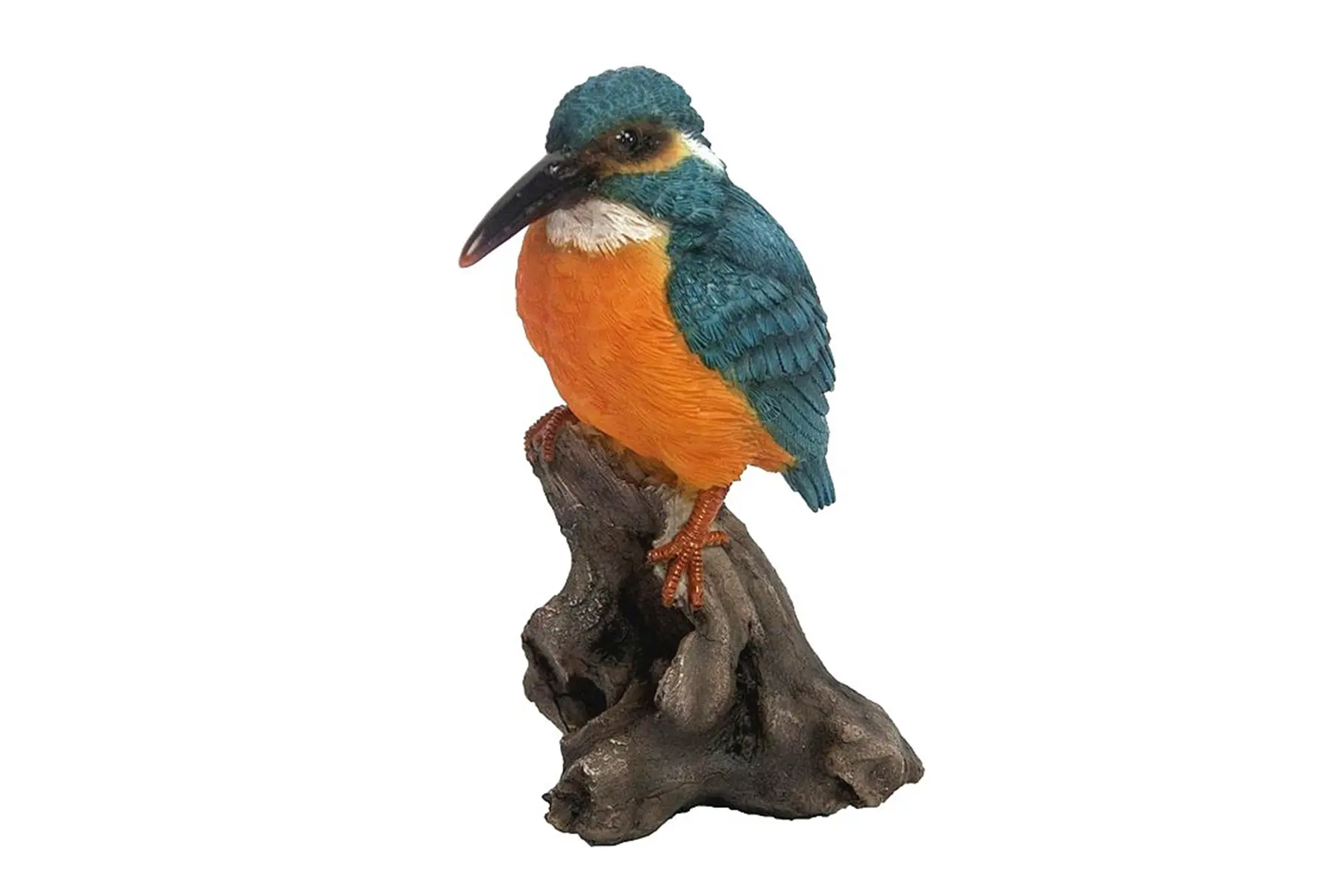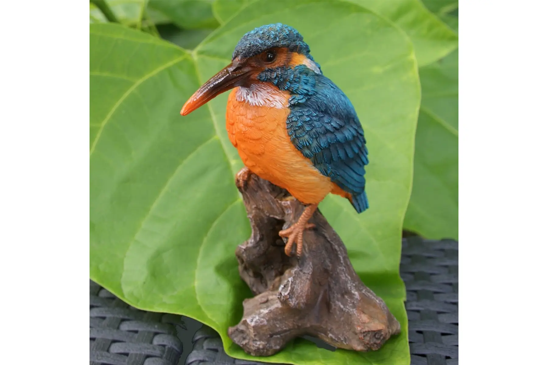 Een prachtig beeld van een ijsvogel, rustend op een tak van Esschert Design. Dit decostuk geeft duidelijk de fijne lange snavel en prachtige kleuren van de ijsvogel weer.