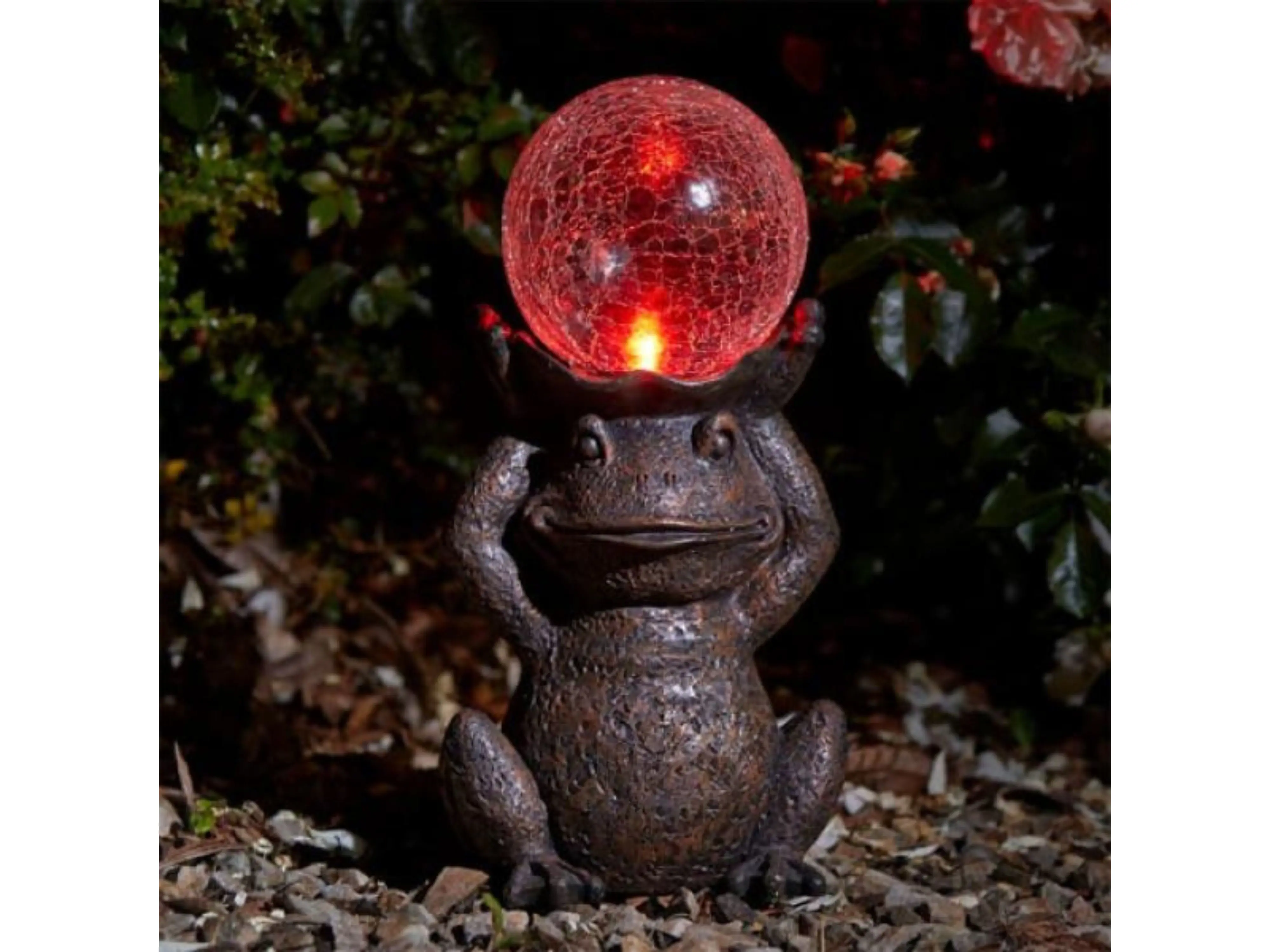 Deze lachende kikker ondersteunt een mooie lichtbol op zonne-energie. Deze tuindecoratie geeft overdag en 's avonds een charmante sfeer aan jouw terras, patio, voordeur of plantenborder. De kikker is leuk gezelschap voor groot en klein en in het duister straalt de lichtbol een feeëriek licht uit.