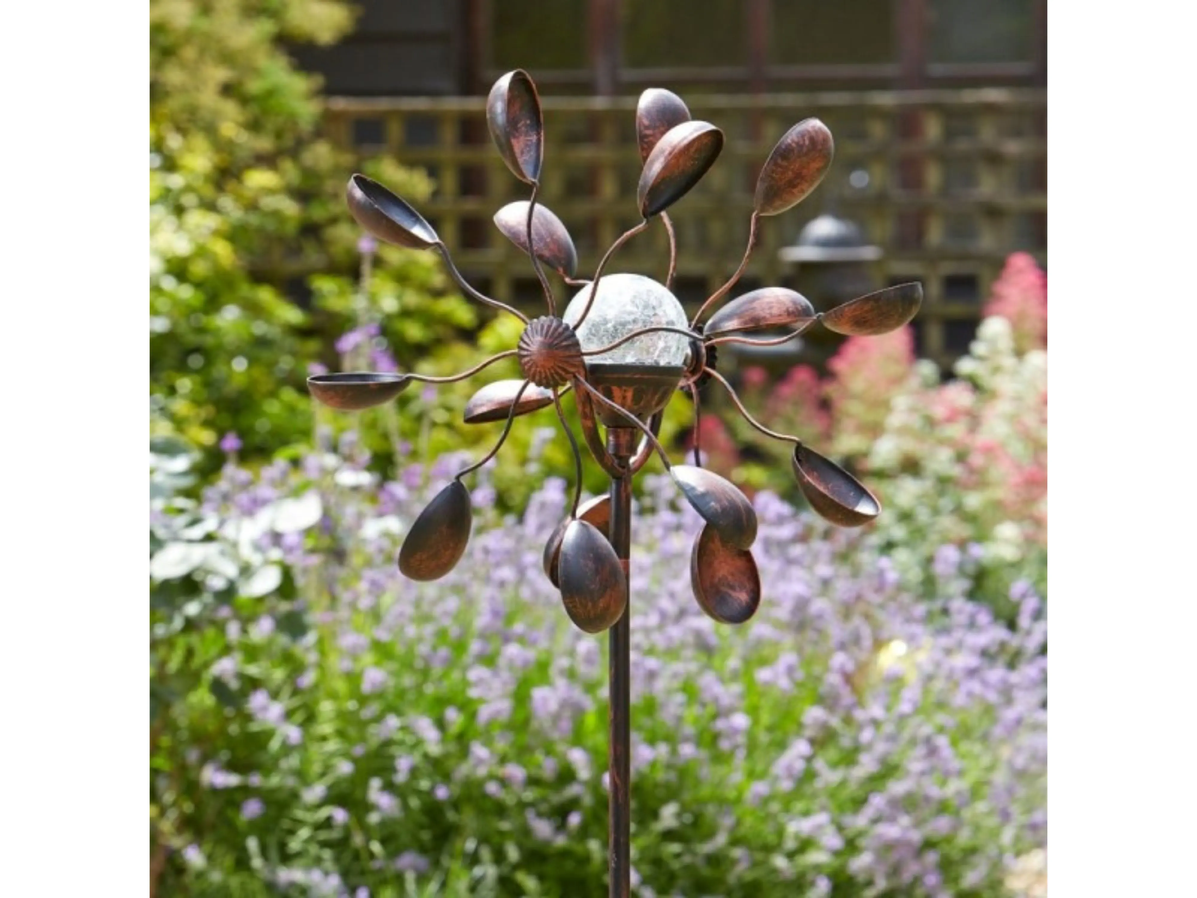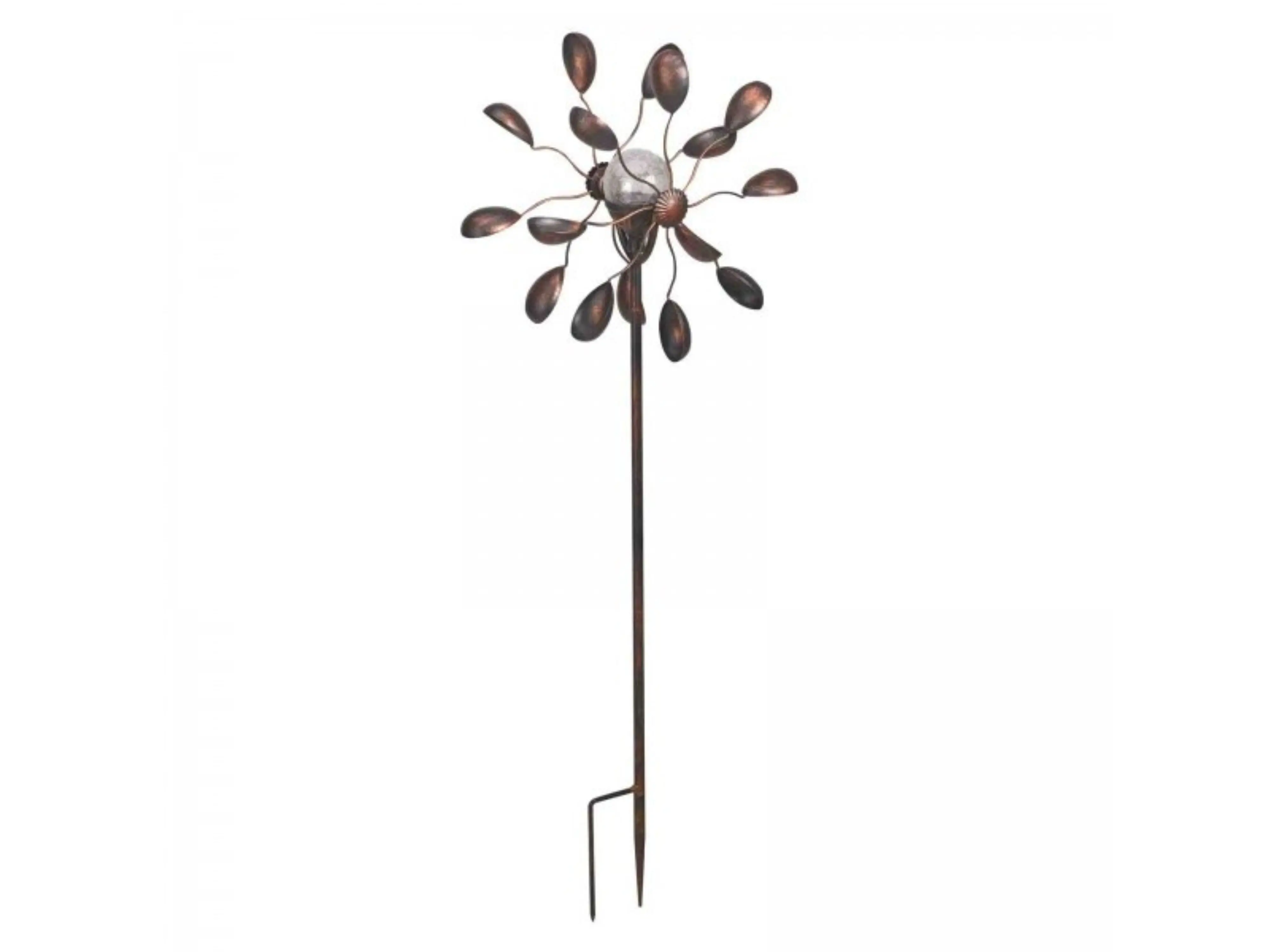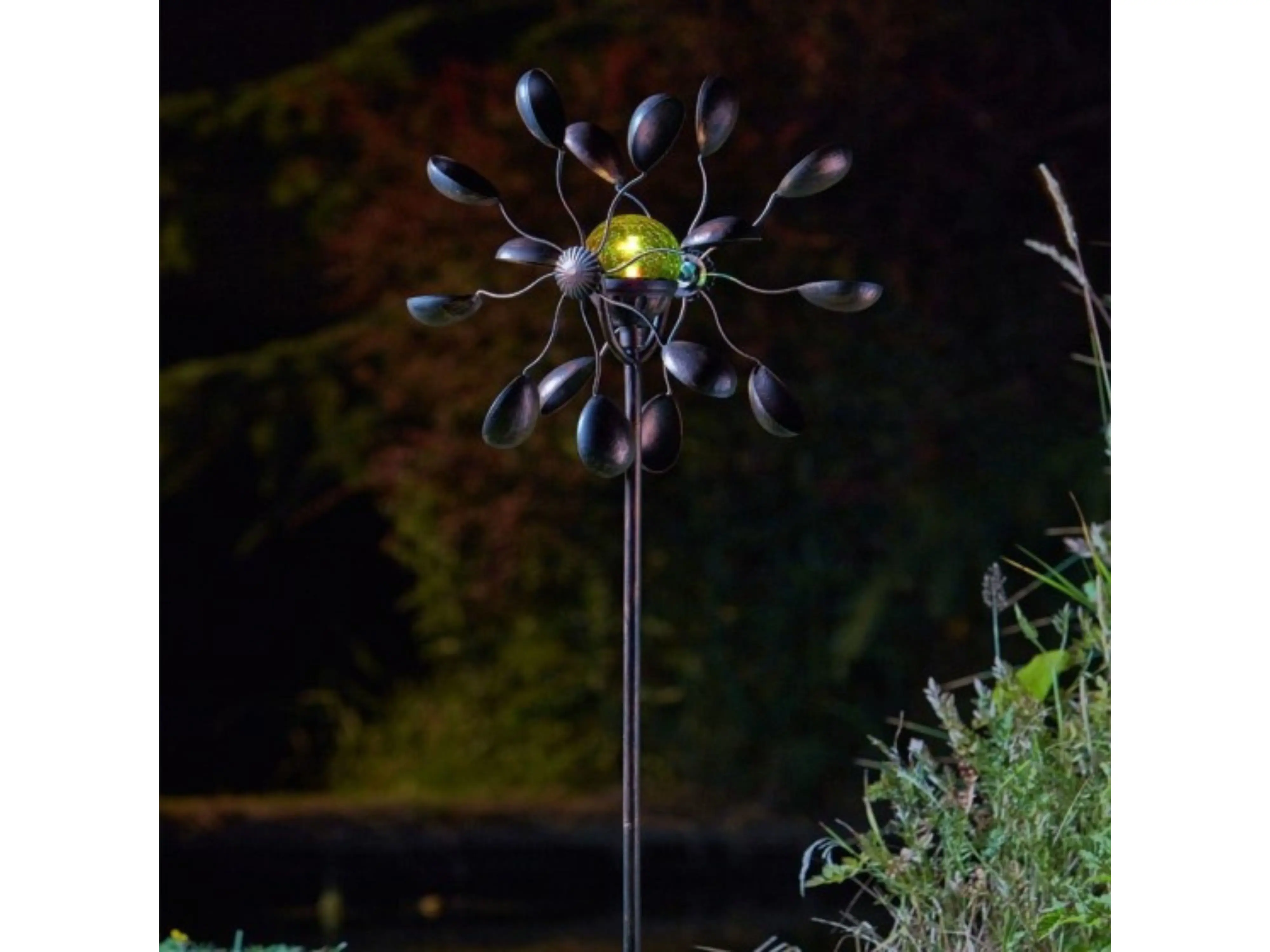 Deze dubbelzijdige windspinner draait heerlijk in de wind dankzij de scheppende lepeltjes die op bloemblaadjes lijken. Centraal tussen de twee draaiende bloemen staat een magische lichtbol in gecrackeleerd glas. De bol licht op als het donker wordt dankzij het geïntegreerde zonnepaneelje dat overdag oplaadt in de volle zon.