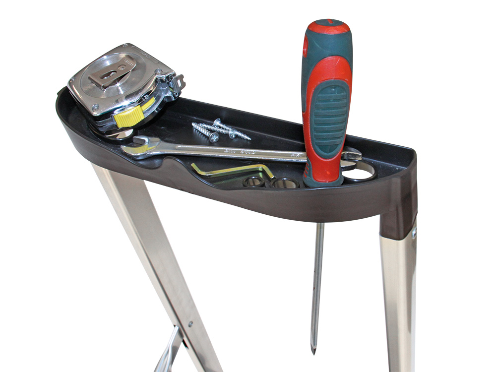 Om de grip op de treden zo lang mogelijk hoog te houden, zijn de profielen behandeld met een vuilafstotende laag. Hierdoor kan je veilig en met vertrouwen werken, zelfs onder vochtige omstandigheden. De trapladder is ook voorzien van een handige gereedschapshouder die zich bovenaan de ladder bevindt. Zo heb je altijd het benodigde gereedschap binnen handbereik.