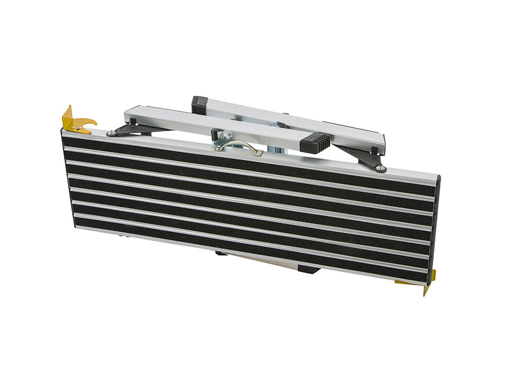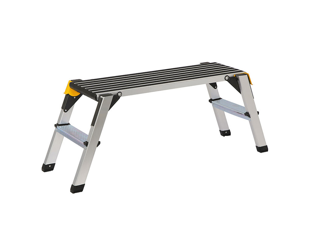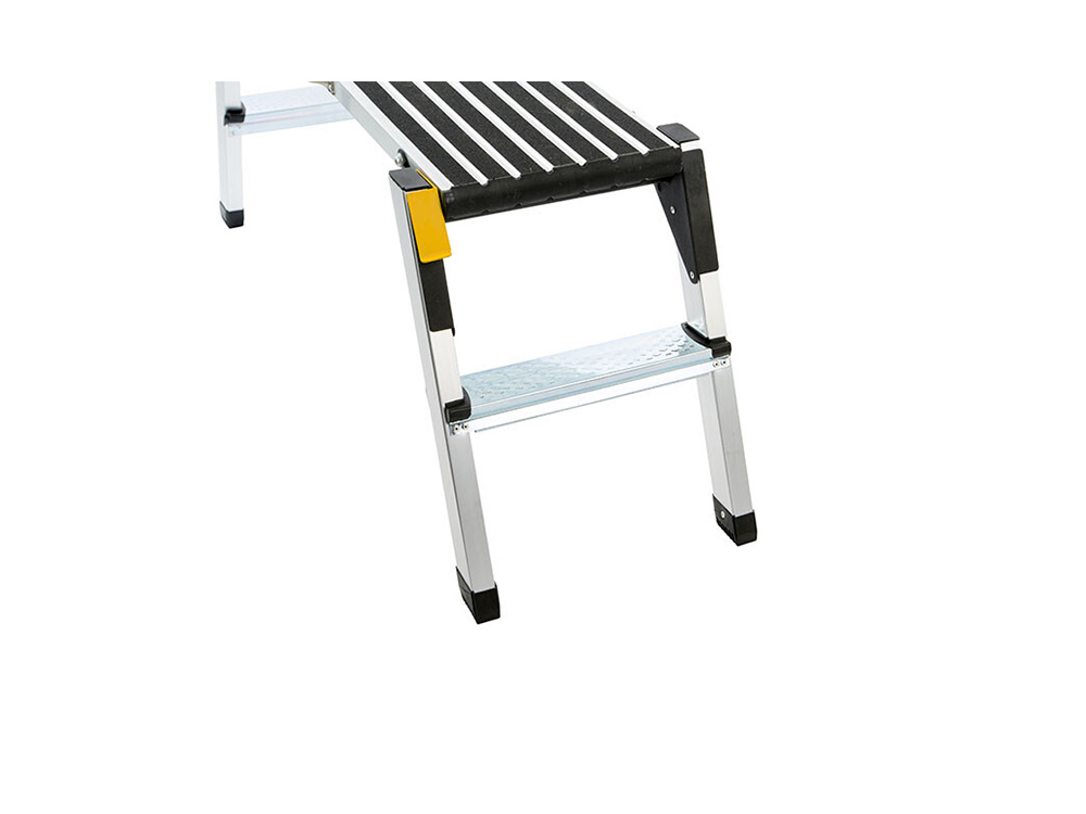 Het werkplatvorm is compact en plooibaar en voorzien van een extra veiligheidsvergrendeling.