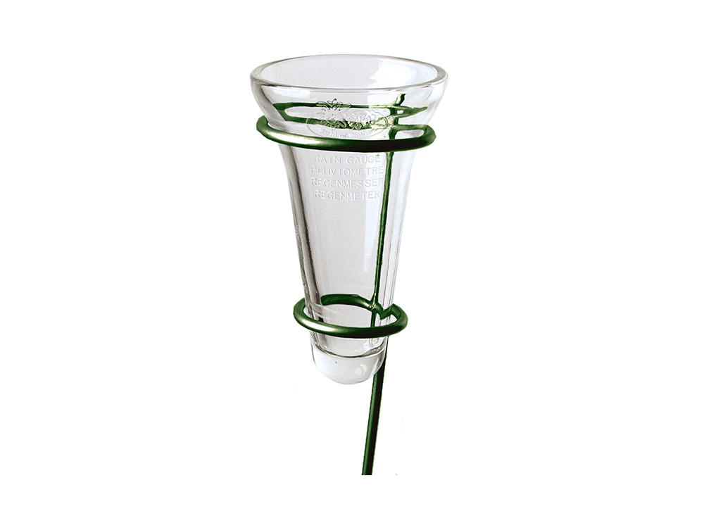 De hoeveelheid neerslag is eenvoudig af te lezen op deze stevige glazen maatbeker. Om verdamping zoveel mogelijk te voorkomen, is het belangrijk om de neerslag minimaal eenmaal per dag te meten.