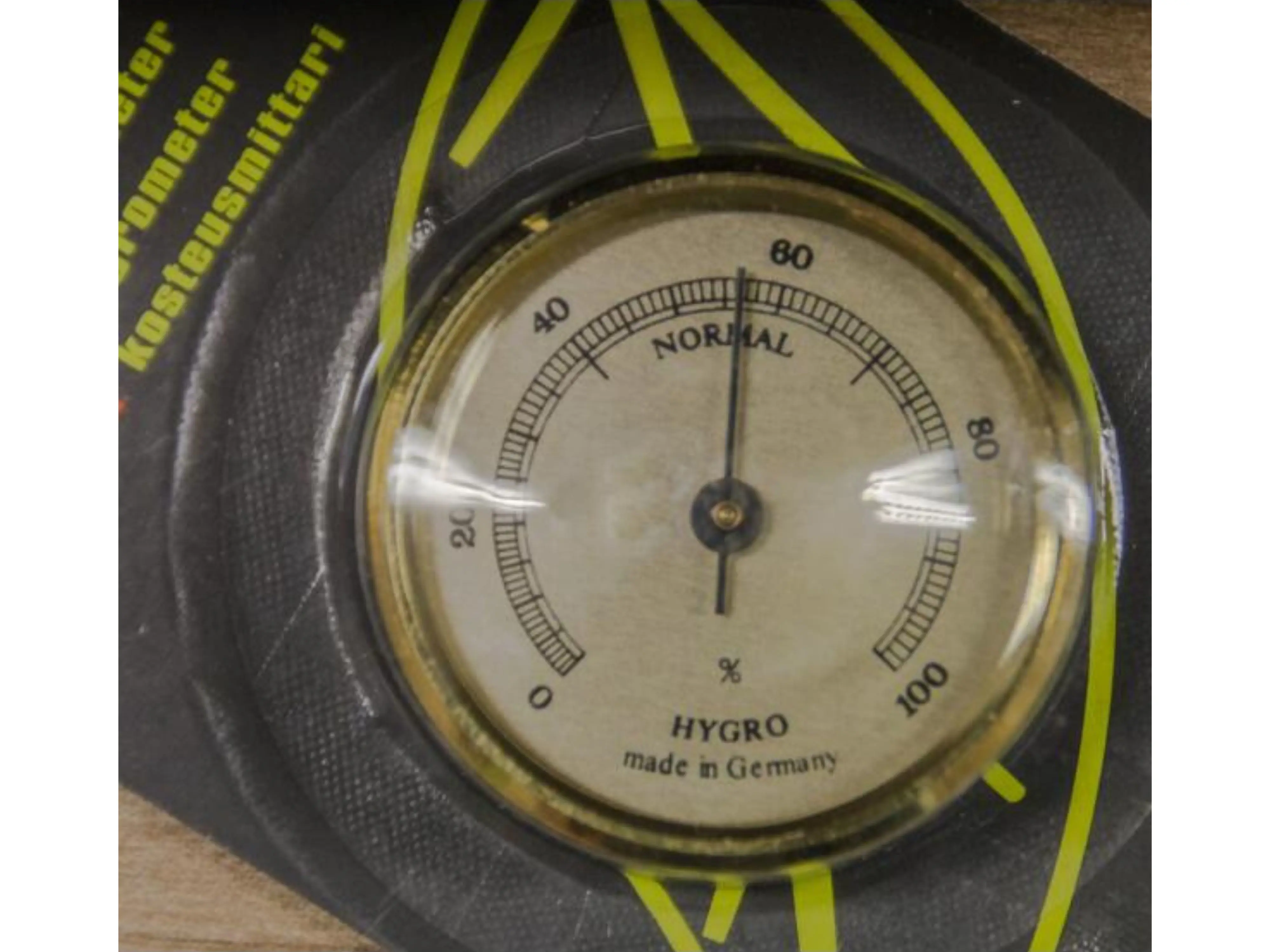 Een hygrometer is een instrument om de vochtigheid van de lucht te meten. Een luchtvochtigheid van 75% is ideaal voor de opkweek van planten, en nadien moeten we de vochtigheid reduceren tot max. 60%. Voorzie een hygrometer aan de ingang van de serre.