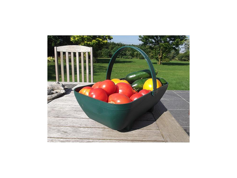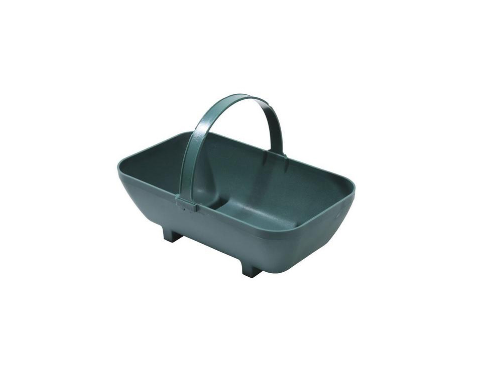 Groen oogstbakje met handvat, handig bij het oogsten van groenten, het plukken van bessen en wanneer je in het bos naar paddenstoelen zoekt. De oogstmand is gemaakt uit duurzaam 100% gerecycleerd groen kunststof (polypropyleen). Het handvat klikt er gemakkelijk in en uit om het bakje op te bergen.
