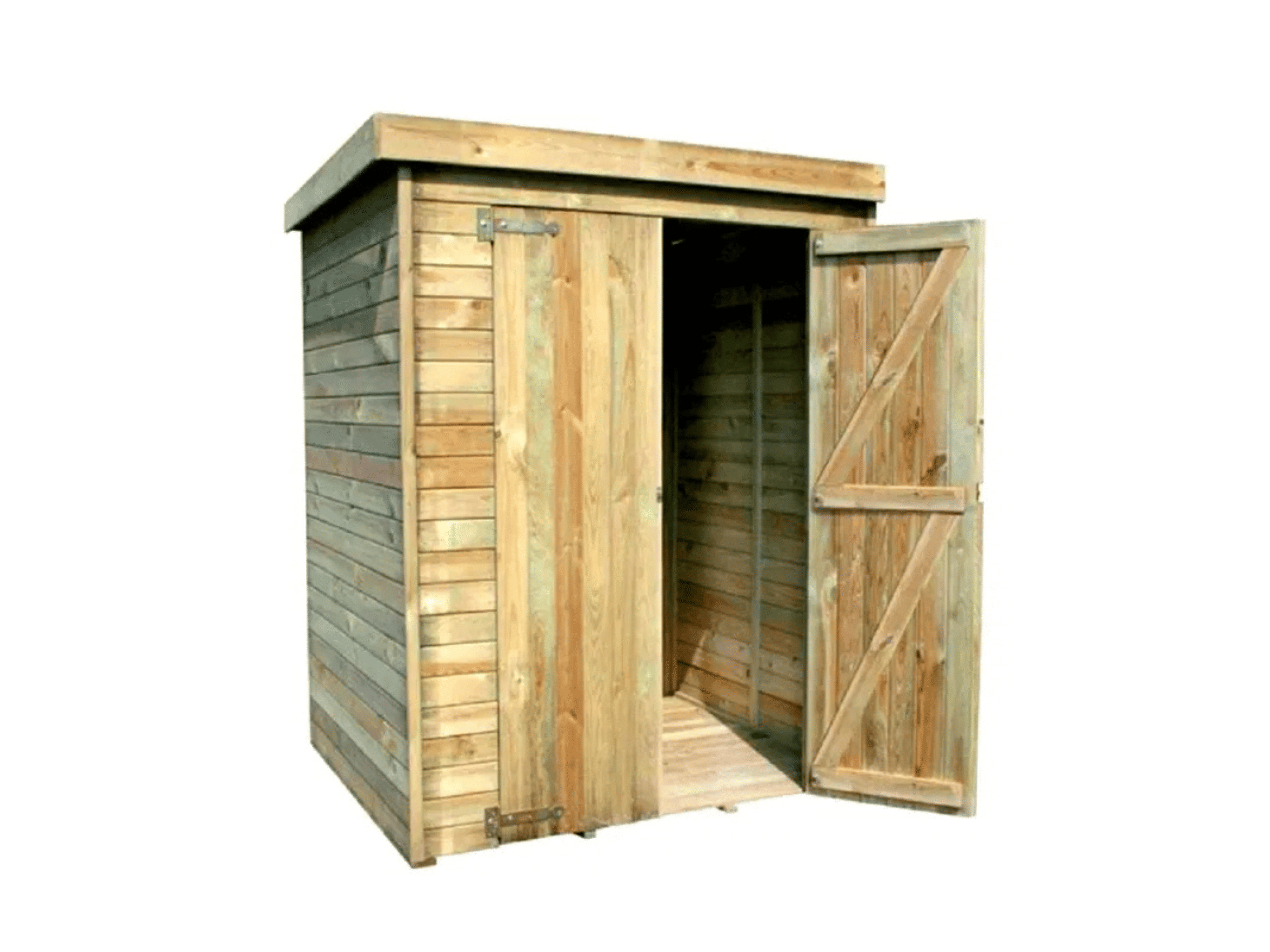 De vloer en het dak zijn waterdicht. De berging is gemaakt van grove den.