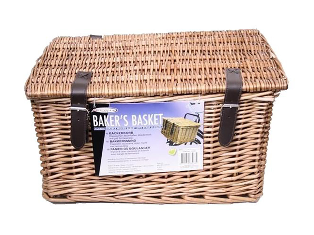 Deze mooie rechthoekige bakkersmand kan op een eenvoudige manier op de voordrager van jouw fiets worden bevestigd. Het deksel is aan de mand vastgemaakt met lederen riempjes en kan gemakkelijk dicht gemaakt worden met een riemsluiting.