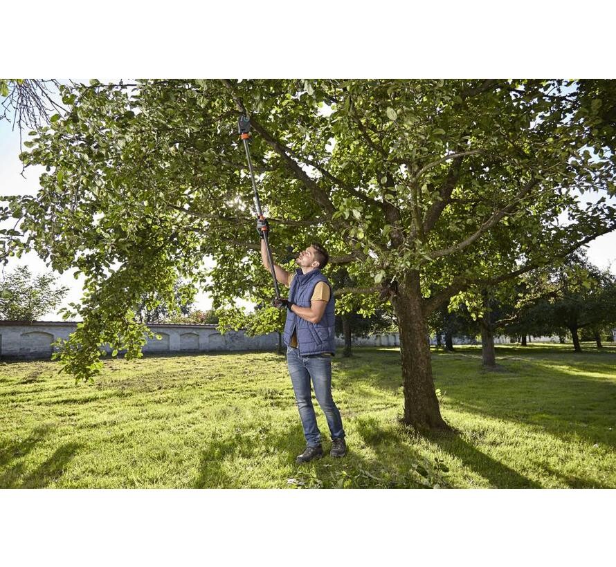 De Gardena boom- en takkenschaar StarCut 160 plus is de specialist voor boomonderhoud. Met een lengte van 160 cm is eenvoudig en veilig zagen van de grond zonder ladder mogelijk. De 12-voudige transmissie zorgt voor krachtig zagen van takken met een diameter tot 32 mm.