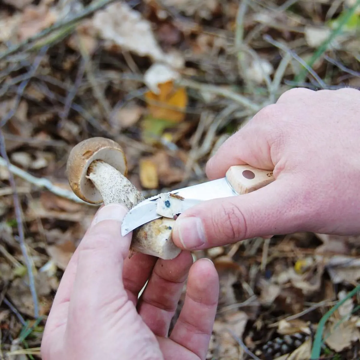 Inklapbaar paddenstoelmes met een speciaal ontworpen gebogen bladvorm om een nauwkeurige snede te maken aan de uiteinde van de paddenstoel. Zo voorkom je dat het delicate mycelium (het netwerk van alle draden in de aarde) wordt verstoord.