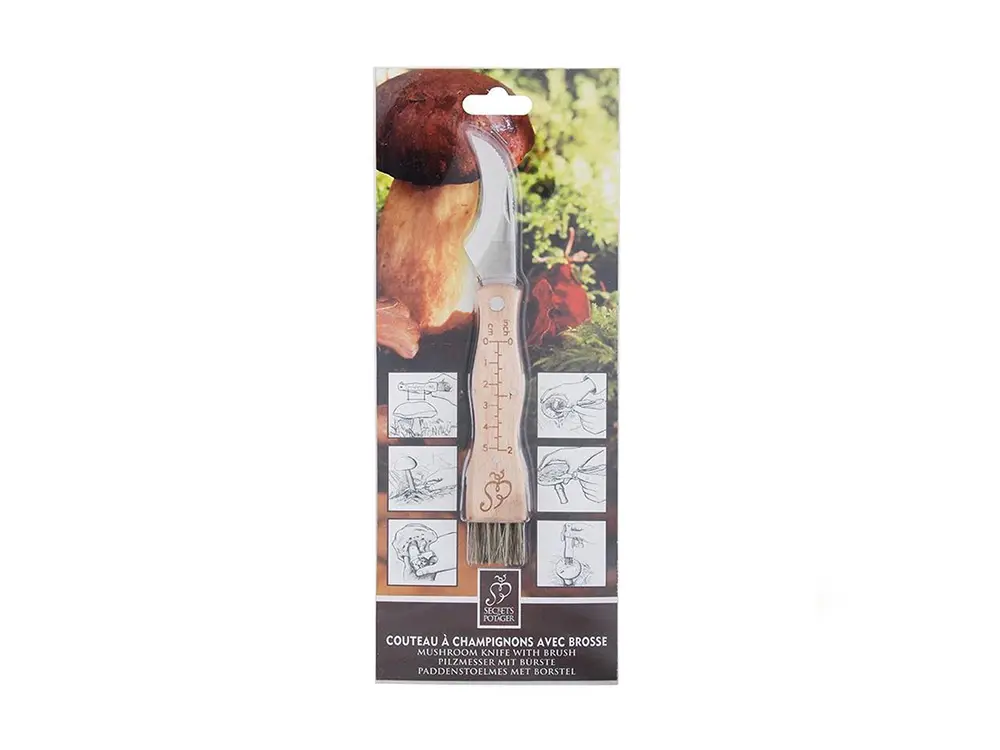 Met de getande rug, kan je gemakkelijk het buitenste huidlaagje /waslaagje op de hoed van de paddenstoel verwijderen en vuil van de paddenstoel afschrapen. Met het borsteltje kan je de paddenstoelen ter plaatse schoon maken waardoor er zo weinig mogelijk zand tussen de oogst blijft zitten.