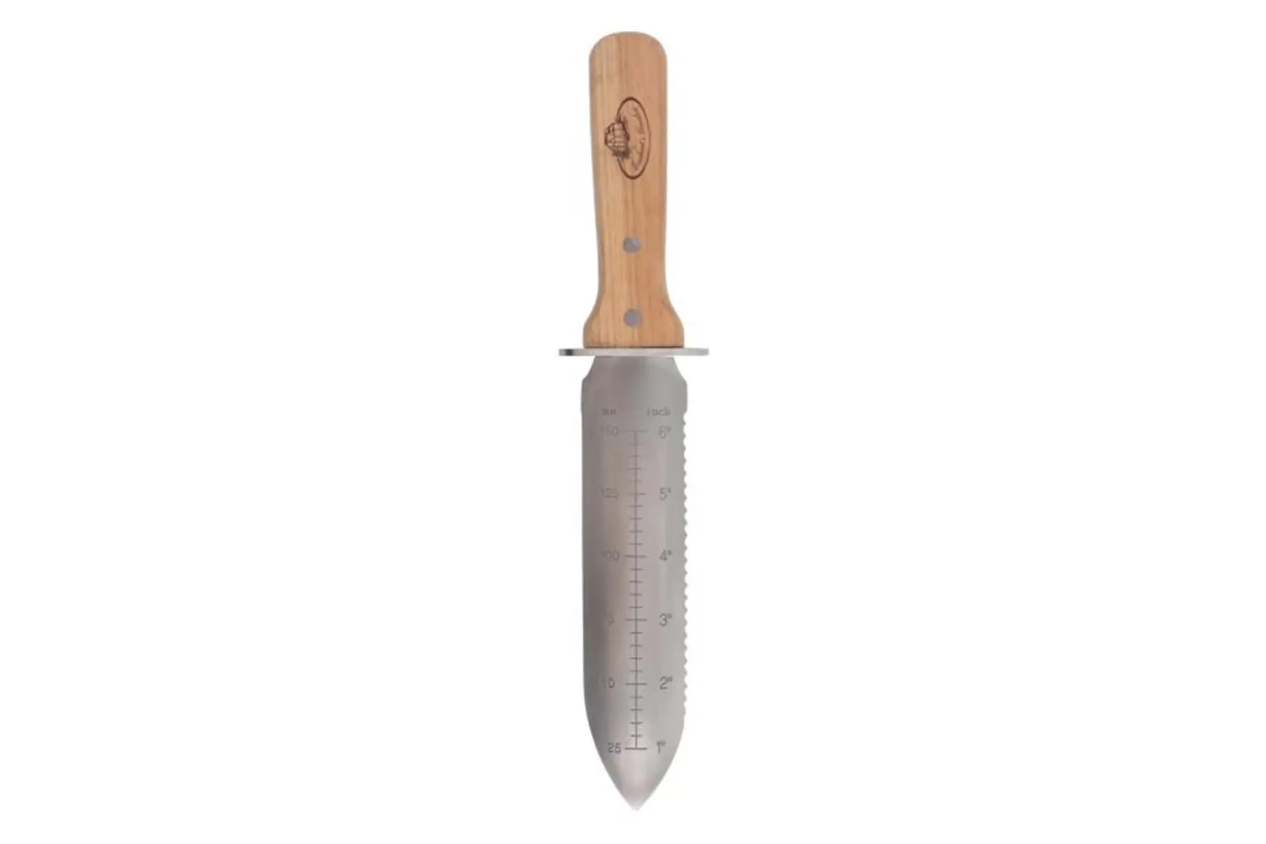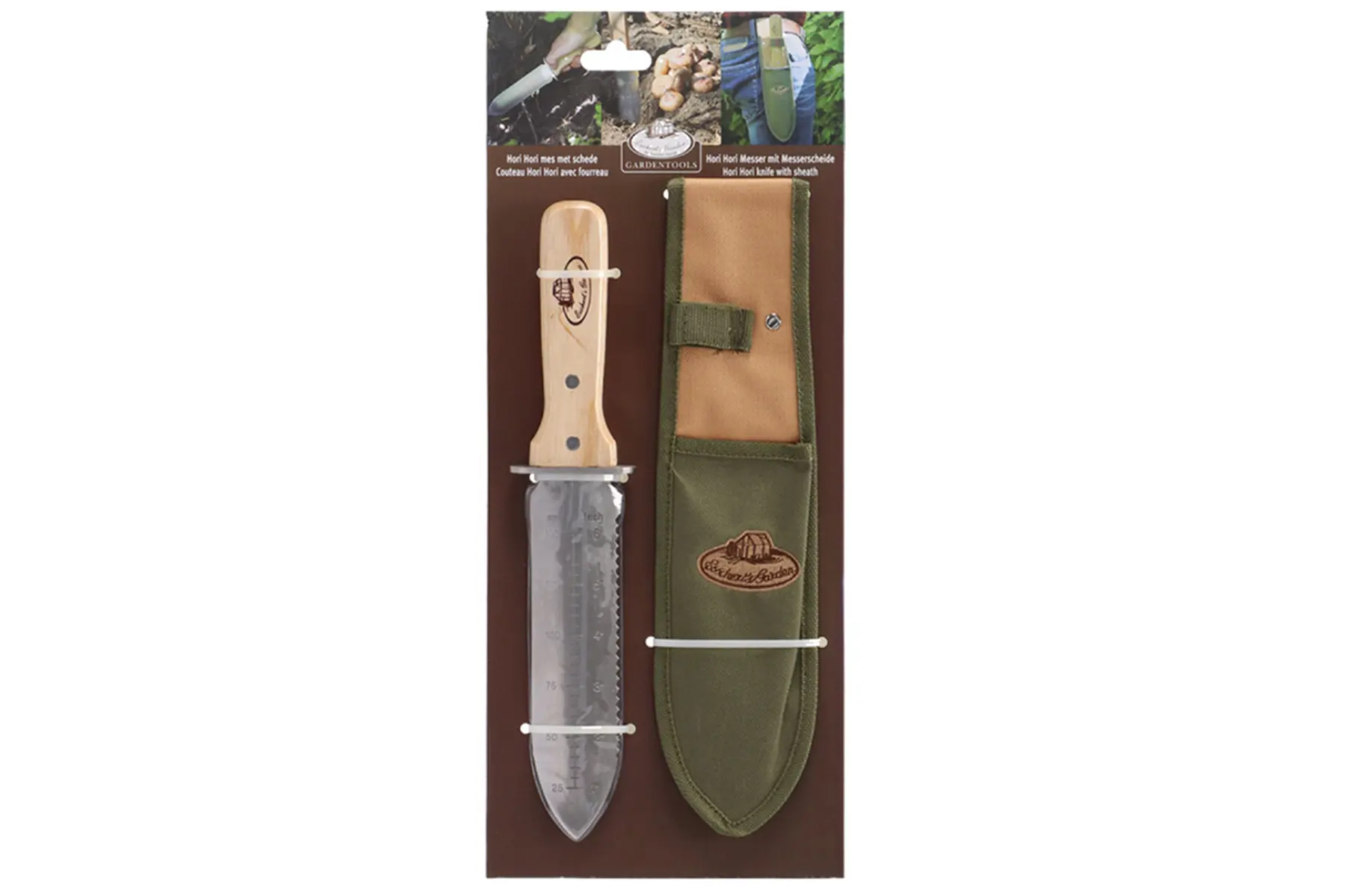 Dit multifunctionele tuingereedschap is een mes, zaag en een graafgereedschap in één. Het kan ook gebruikt worden voor het verplanten van zaailingen of als meetinstrument voor het poten van bloembollen. Met de bijgeleverde schede draag je het mes aan de broeksriem overal mee in de tuin.