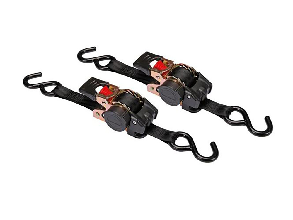 Handige zelfoprollende ratelspanbanden voor het vastzetten van allerlei ladingen. Met deze twee banden zet je bijvoorbeeld moeiteloos een zitmaaier vast op de aanhangwagen.