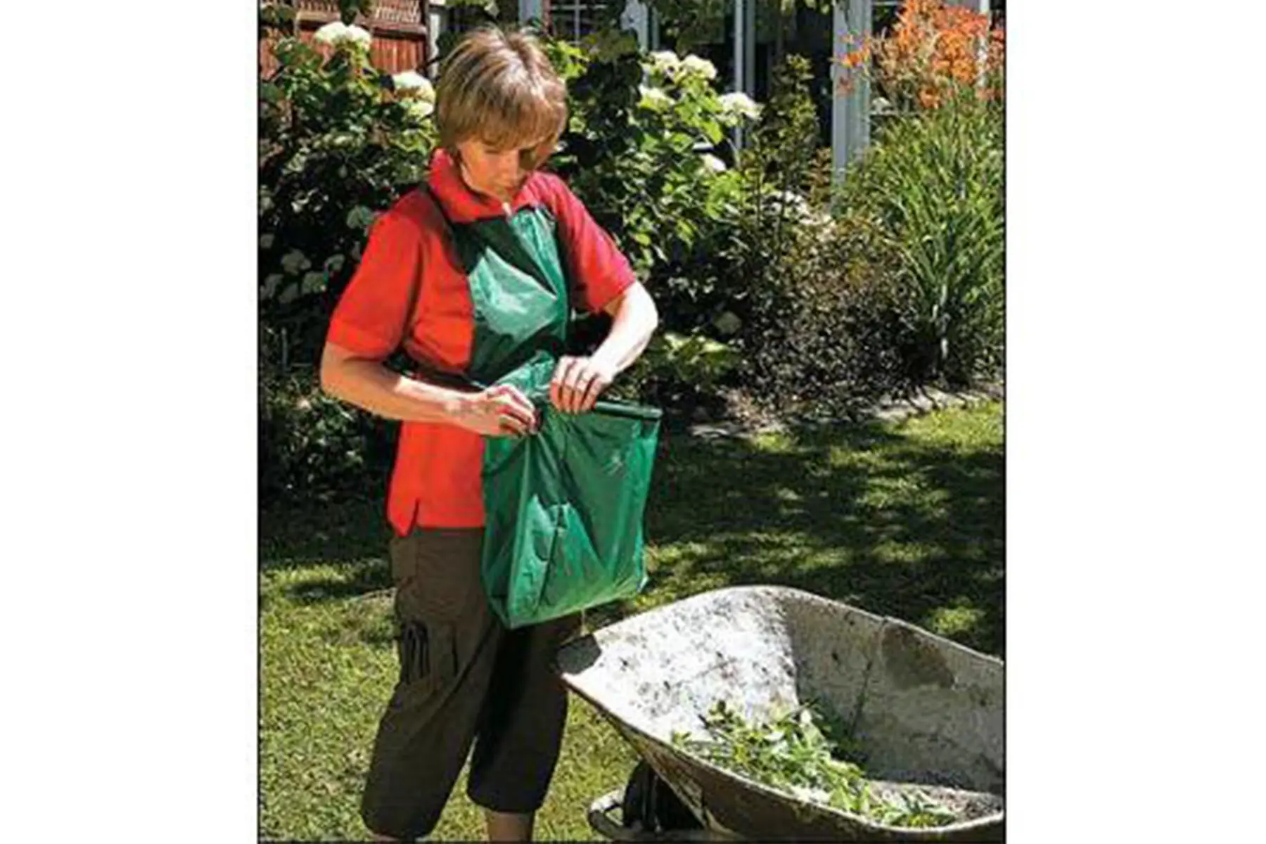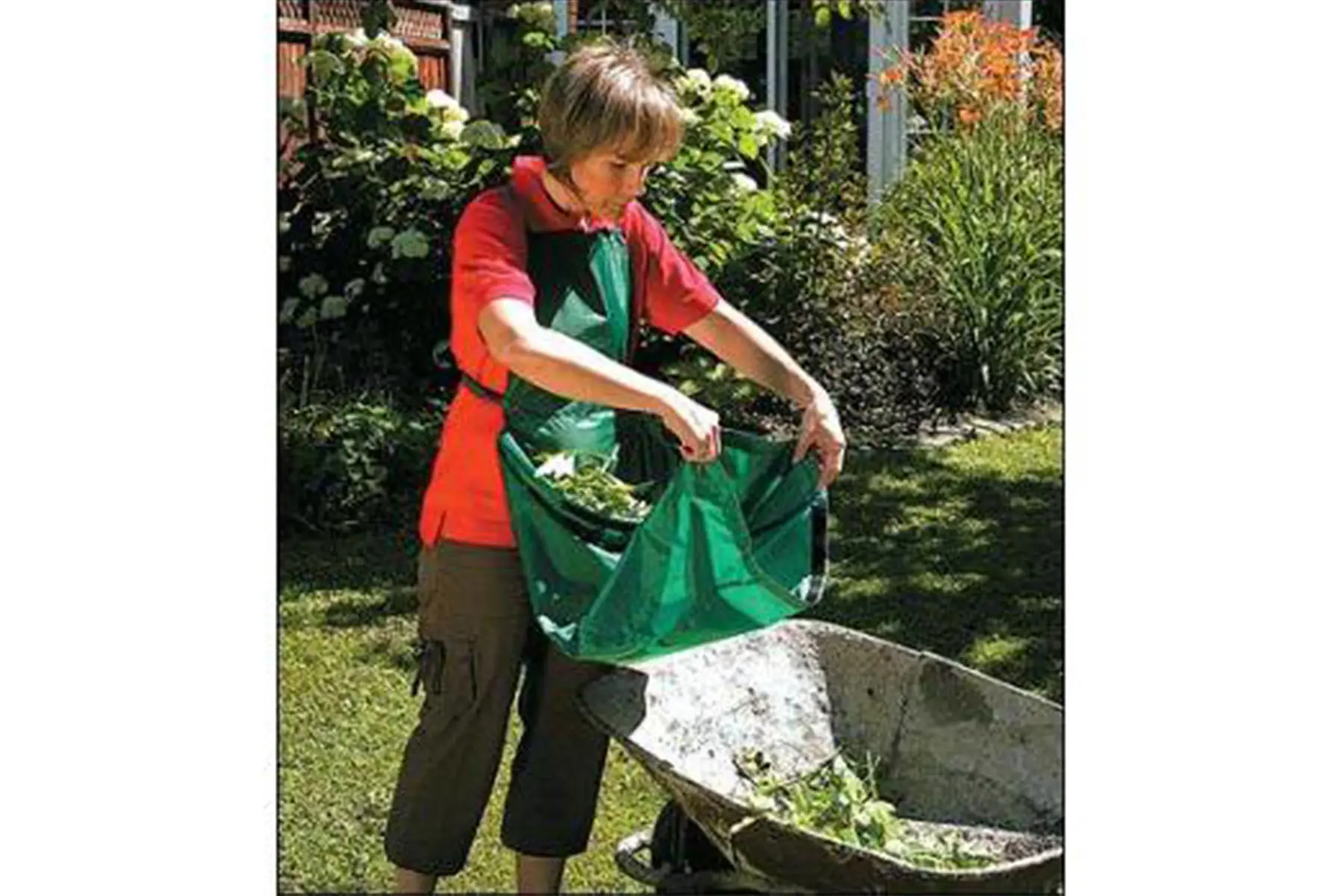 Super originele en handige tuinschort! Ideaal bij het weg plukken van verwelkte bloemen, bij het wieden of snoeien,... Na het snoeien of wieden kan je de uitgebloeide bloemen of onkruid in de schortbuidel deponeren. Ben je klaar met de tuinklus dan hoef je enkel nog de klittenband te lossen zodat de schort zich ontvouwt tot een lange tunnel waarbij alle afval rechtstreeks in een tuinafvalzak, kruiwagen of op de compost kan worden gedropt.
