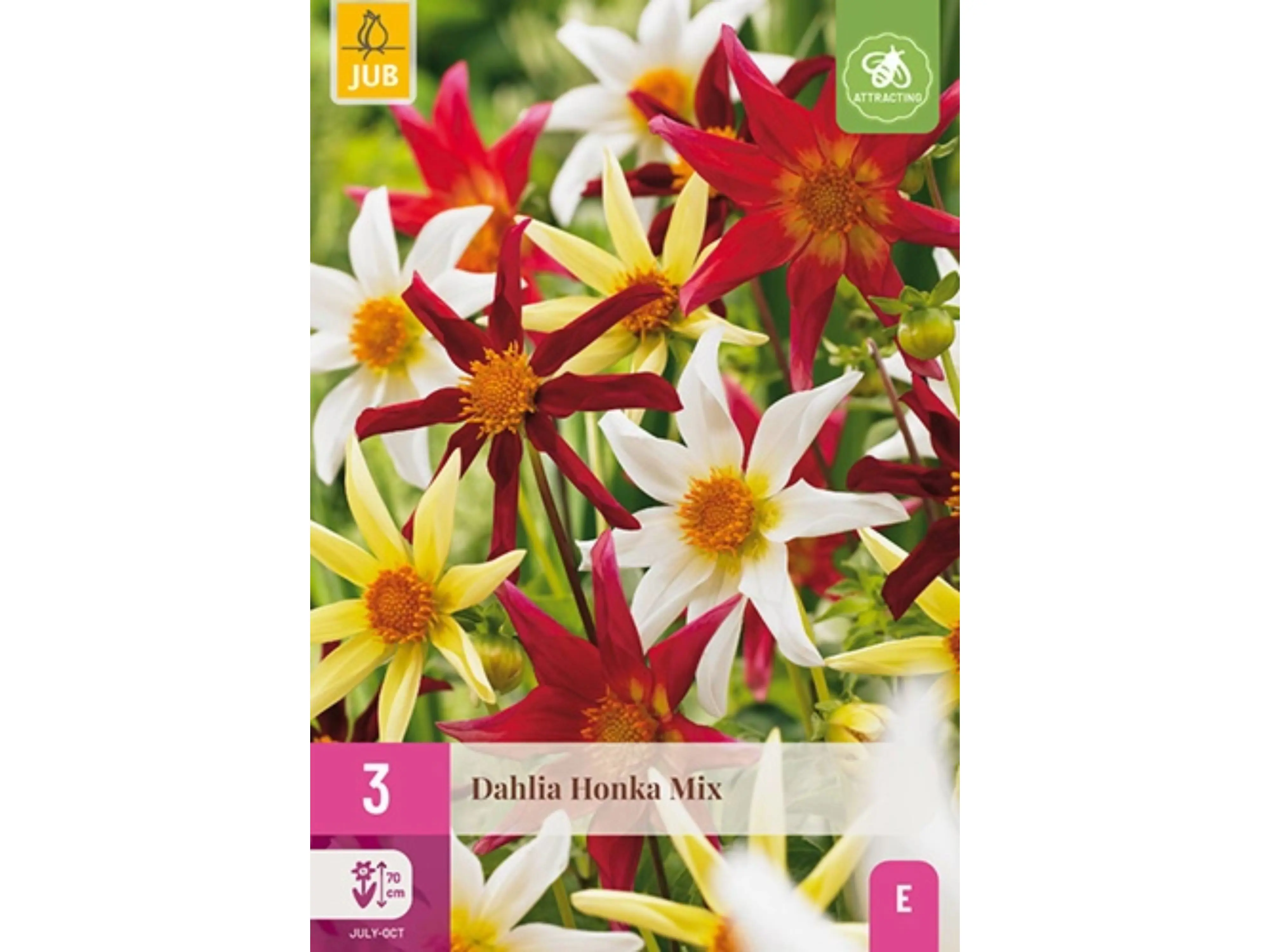 De dahlia mix ‘Honka Mix’ is een uitbundige zomerbloeier die maandenlang kleur en leven in de tuin brengt. Van juli tot de eerste nachtvorst bloeien de planten rijkelijk. Met een hoogte van circa 60 cm kunnen de stelen soms wat ondersteuning gebruiken.
