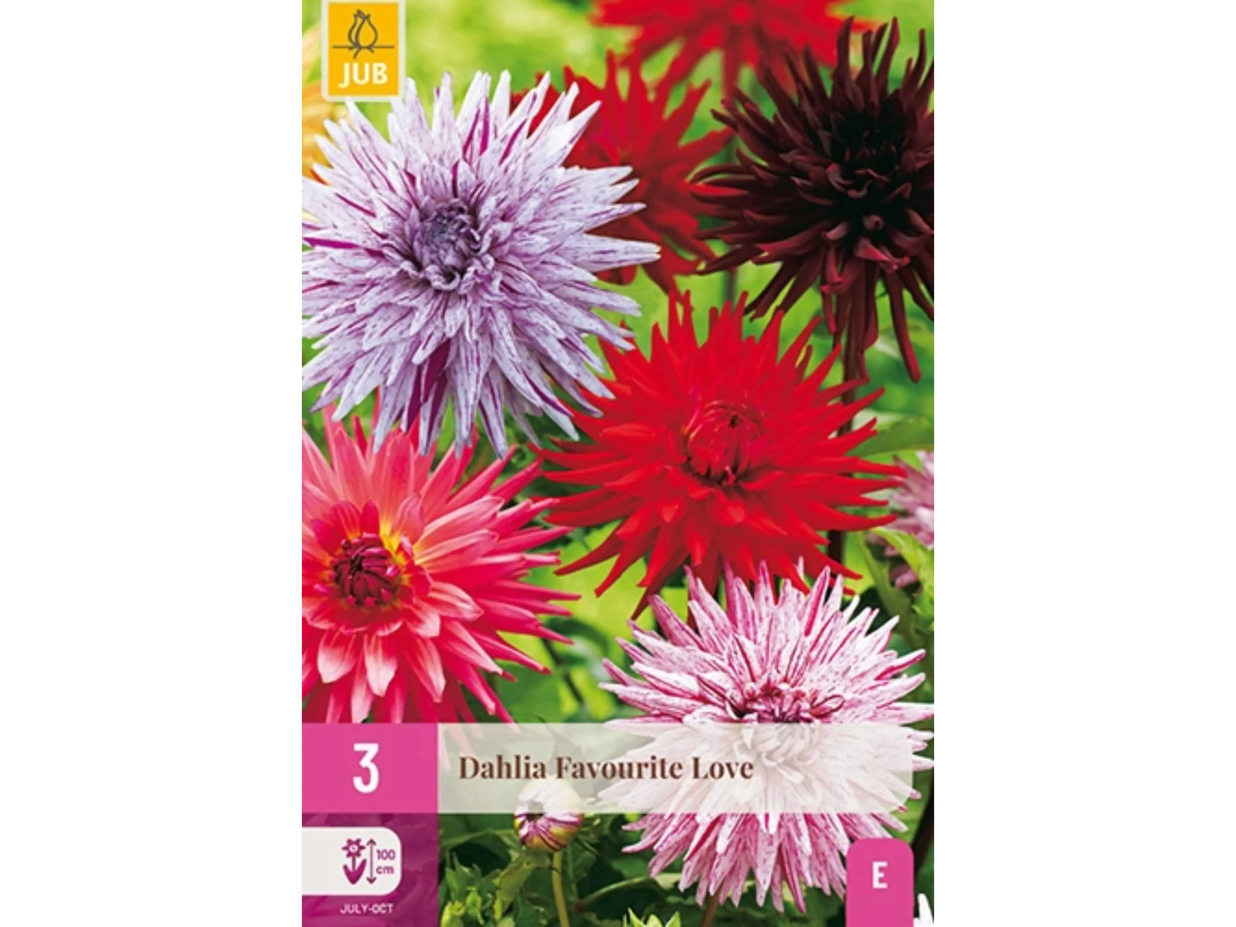 De decoratieve dahlia mix ‘Favourite Love’ brengt kleur en sfeer in de zomertuin met haar opvallend grote bloemen. Vanaf juli tot aan de eerste nachtvorst blijft deze dahlia rijk bloeien. De planten bereiken een hoogte van circa 90–100 cm en kunnen bij stevige bloei wat ondersteuning gebruiken om de stelen recht te houden.